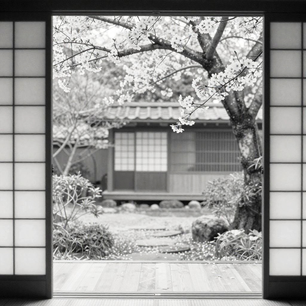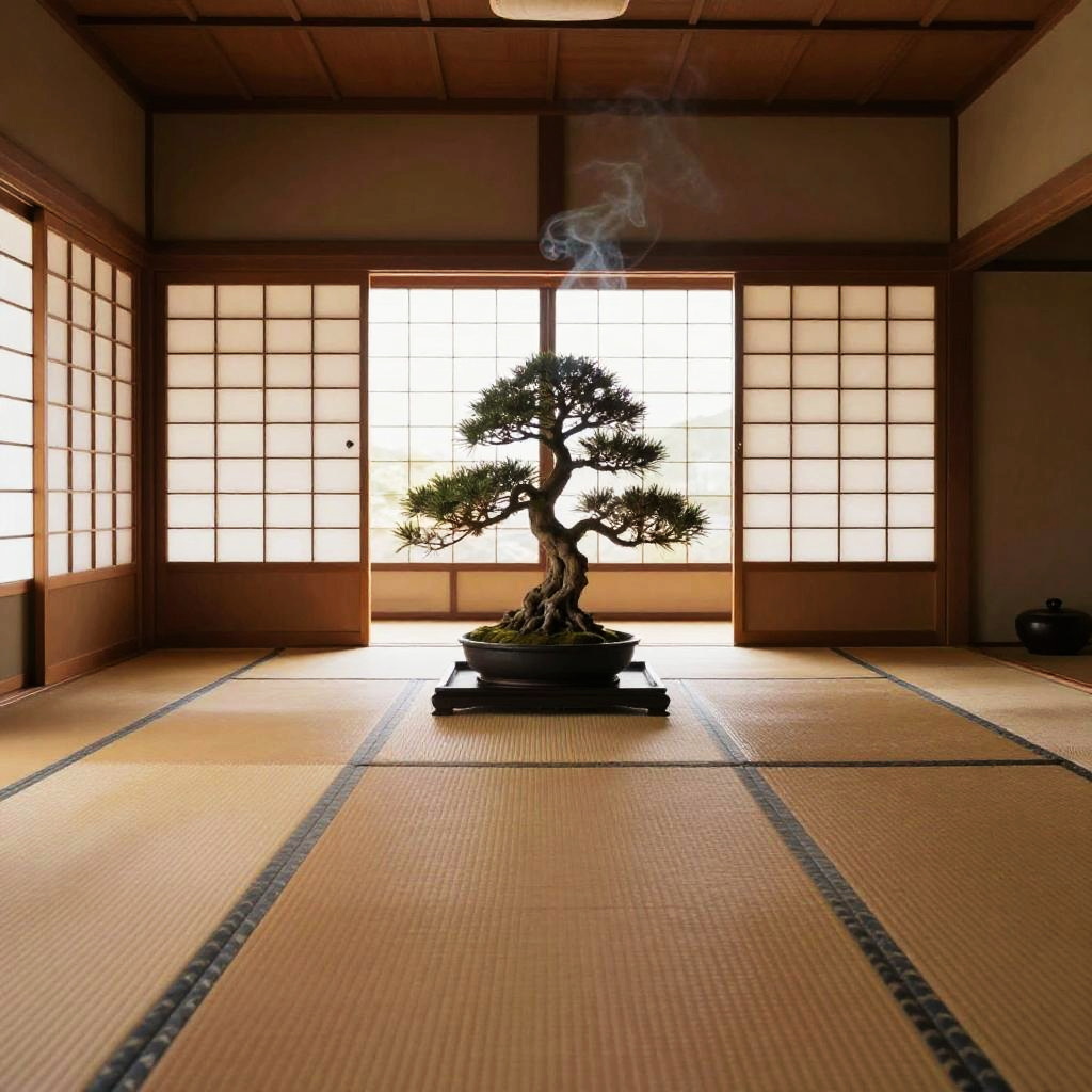Zen sect peaceful meditation hall with tatami mats, shoji screens, a single bonsai tree centerpiece, subtle incense smoke, calm and focused atmosphere, traditional Japanese interior design