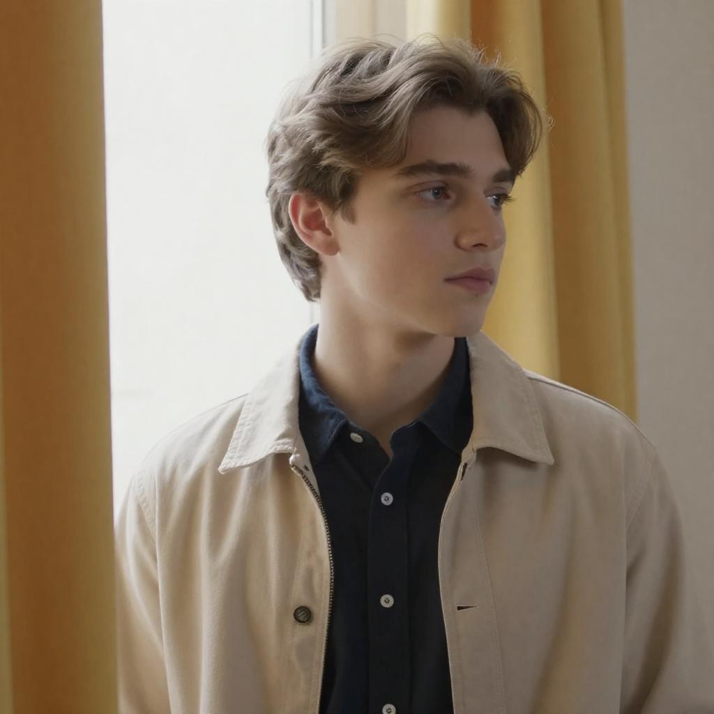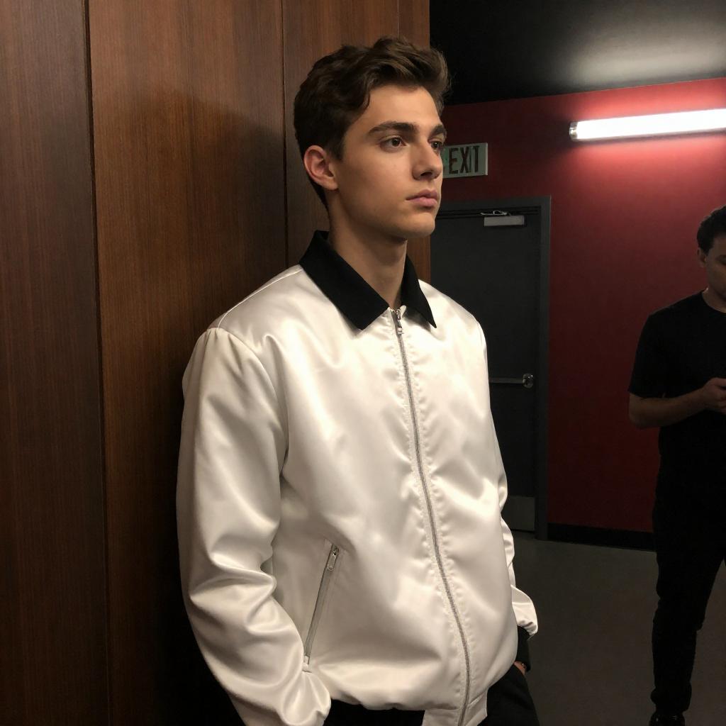 Photograph of a young man with short brown hair, wearing a shiny white satin jacket with black collar, leaning against a dark wooden wall. Background includes a red-painted wall, door with glowing exit sign, and fluorescent light. He has a neutral expression, looking slightly to the side. One hand in pocket. Dark, moody lighting. Two people visible, one in foreground, one in background.