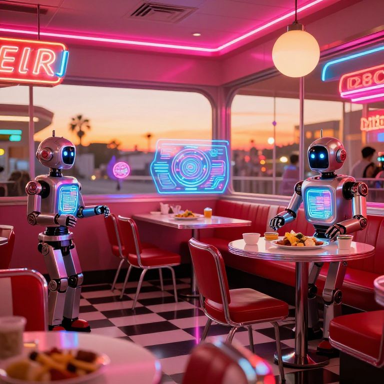 Retrofuture diner scene, mixing classic American 1960s style with futuristic holograms and robots serving chrome-plated dishes, vibrant neon signs, checkerboard floors reflecting neon lights, sunset through large glass windows, warm color palette.