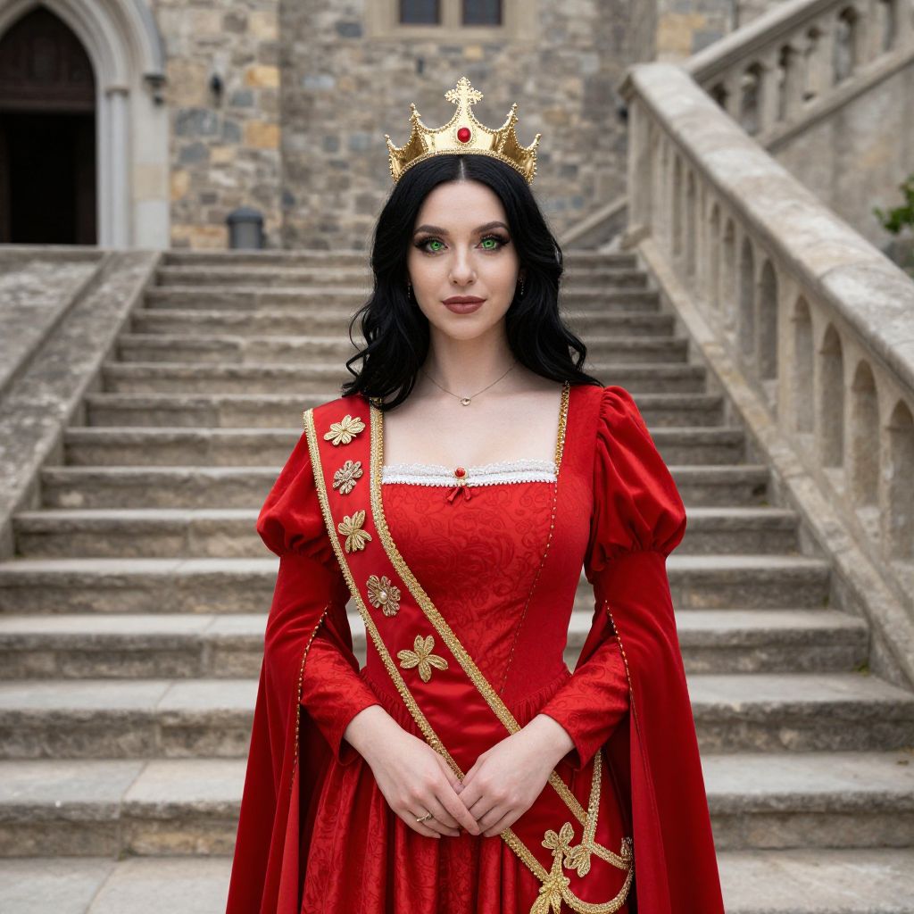 Photograph of a fair-skinned woman with dark, wavy hair, wearing a red velvet gown with gold floral embroidery and a gold crown. She stands on stone steps, with a castle-like stone building in the background. Her green eyes are accentuated with dark makeup, and she wears a delicate necklace. The gown has puffed sleeves and a square neckline. The steps and stone walls have a weathered texture. The image has a slightly surreal, digital enhancement, giving it a fantasy-like quality.