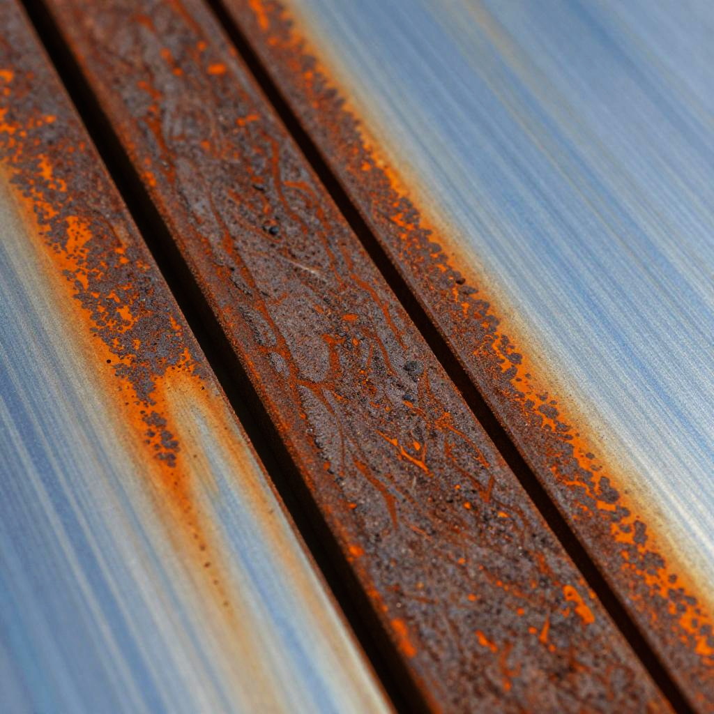 Close-up of corrigate aluminum panels with intricate rust patterns, vibrant orange and brown hues contrasting with cool blue tones, macro shot emphasizing fine details and textures, artistic industrial style.