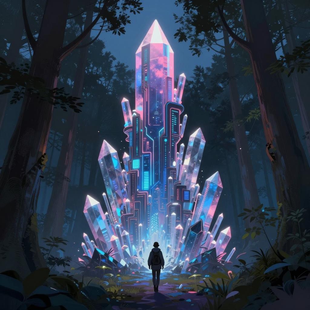 A digital painting of a towering crystal structure glowing in neon pink and blue hues, set within a dense, dark forest. A lone figure walks towards the luminous cyberpunk-style tower at dawn, surrounded by tall trees and sharp crystalline formations. The artwork features intricate details and sharp focus, blending elements of nature and futuristic design in a highly stylized environment.