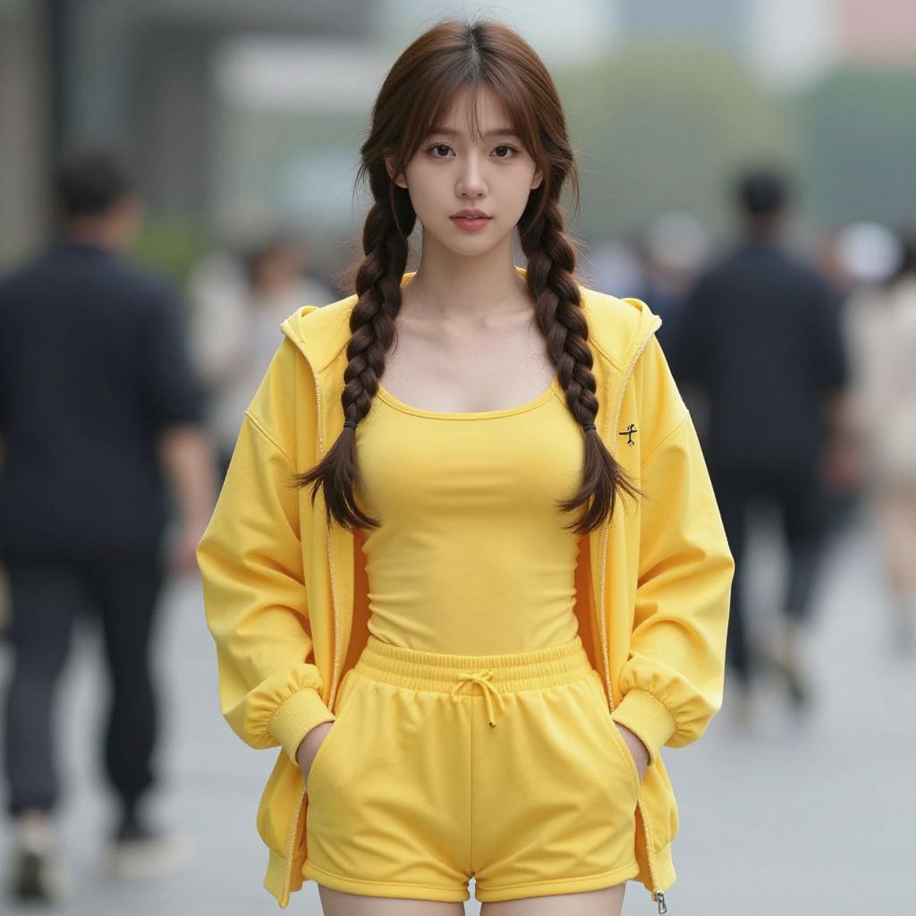 Photograph of an East Asian woman with long braided brown hair, wearing a bright yellow tracksuit and matching jacket, standing in a blurred urban street