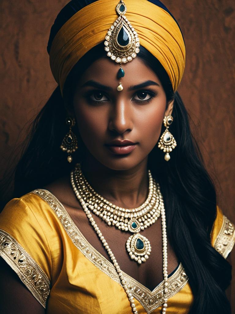 Krishna male dress costume, solo, jewelry, 1girl, earrings, necklace, black hair, looking at viewer, realistic, long hair, turban, dark skin, upper body