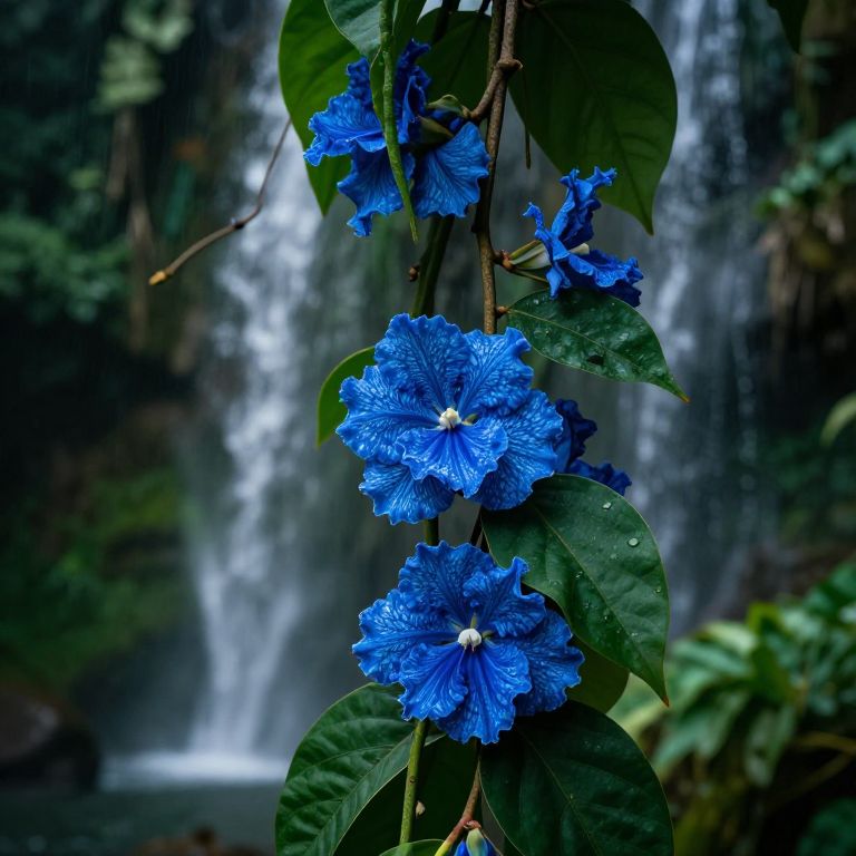 Close-up of blue tropical flowers blooming on a dense jungle vine, bold colors with intricate patterns on petals, contrasting against dark green leaves, with a misty waterfall softly blurred in the background.