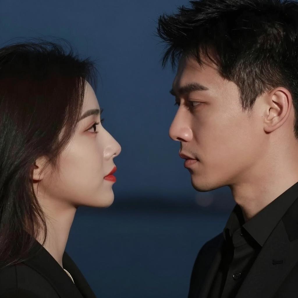 A woman with long black hair, blue eyes, and light skin in the foreground, wearing a light blue shirt. A man with dark hair, light skin, and a serious expression stands behind her on the left, also in a light blue shirt. Dark background, contrasting light on their faces. Two people, close-up.