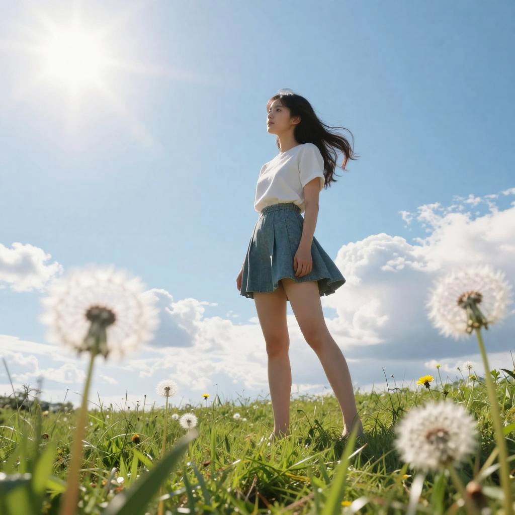 (masterpiece:1.3), (best quality:1.2), 8k, absurdres, unity 8k wallpapper, (extremely detailed:1.3), highestres, realistic, 1girl, form below, low_angle_human, sky, cloud, grass, blurry foreground, full body, (green:1.2), sun, (dandelion:1.1), barefoot