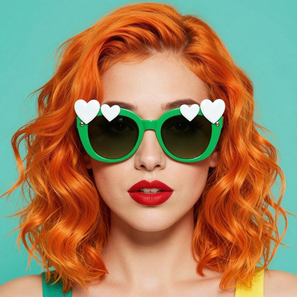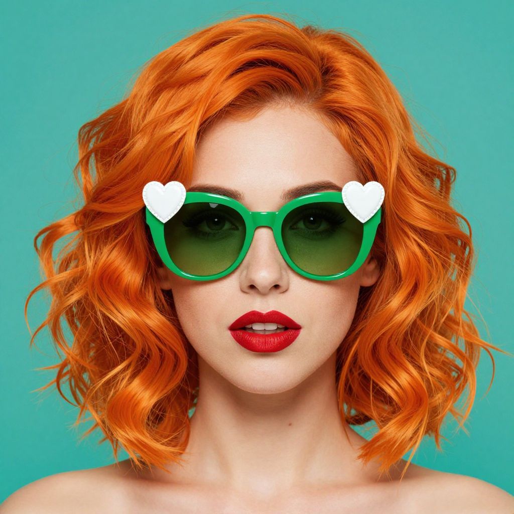 Vibrant portrait featuring a woman with fiery orange curls styled in voluminous waves, wearing oversized green sunglasses adorned with white heart embellishments, paired with bold red lipstick and a confident expression against a teal background.