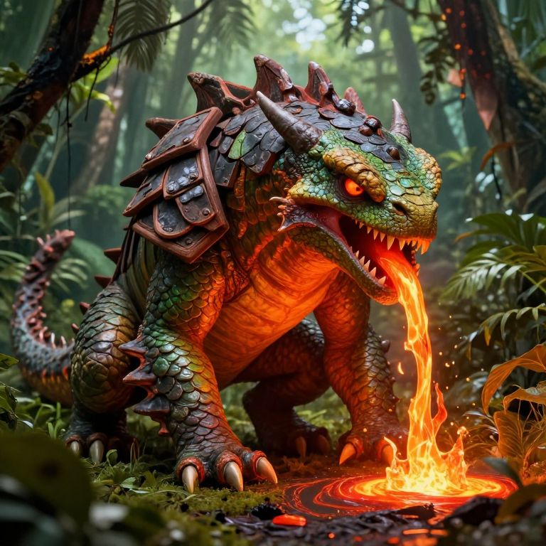 Dodogama depicted in a lush jungle environment, vibrant scales mixed with rocky armor plates, licking molten lava dripping from its mouth, fierce expression, surrounding vegetation slightly scorched, fantasy creature concept art, highly detailed and vivid colors