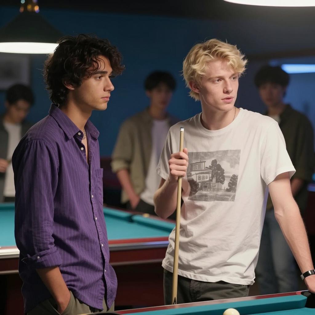 Two young men in a dimly lit bar. The man on the left has dark, wavy hair, wears a purple striped shirt, and looks to the side. The man on the right has blonde hair, wears a white t-shirt with a picture, and points a pool cue towards the right. Background: blurred people, pool table, and blue walls. Three other people in the background.