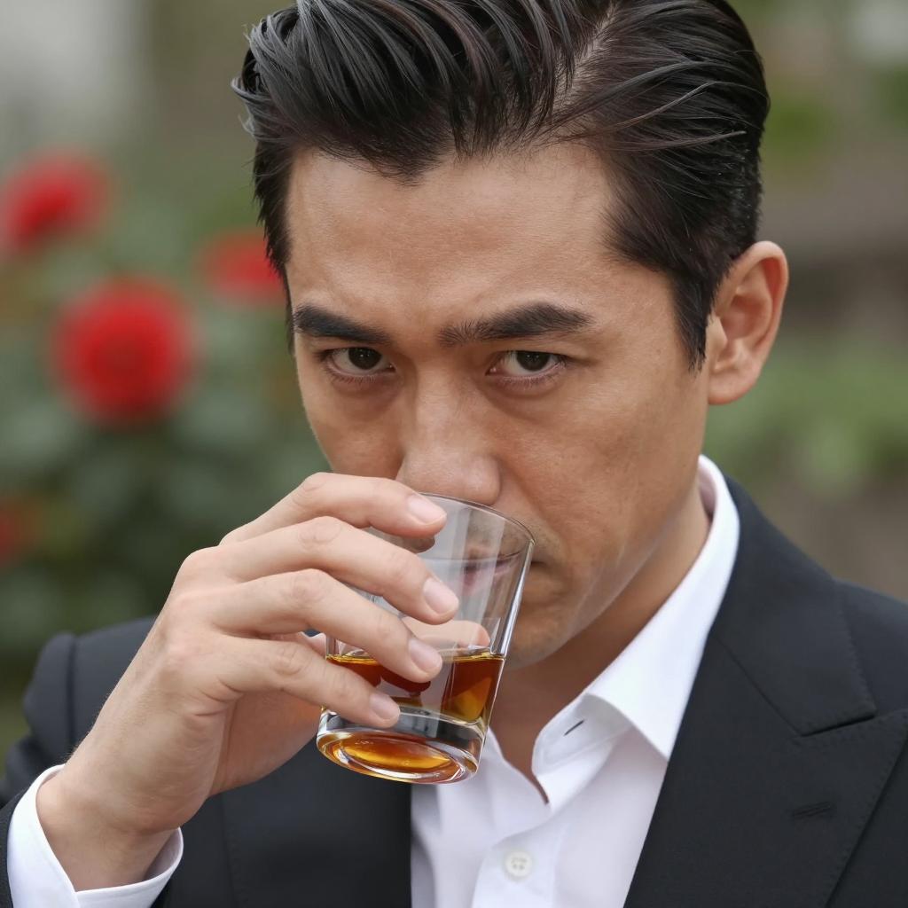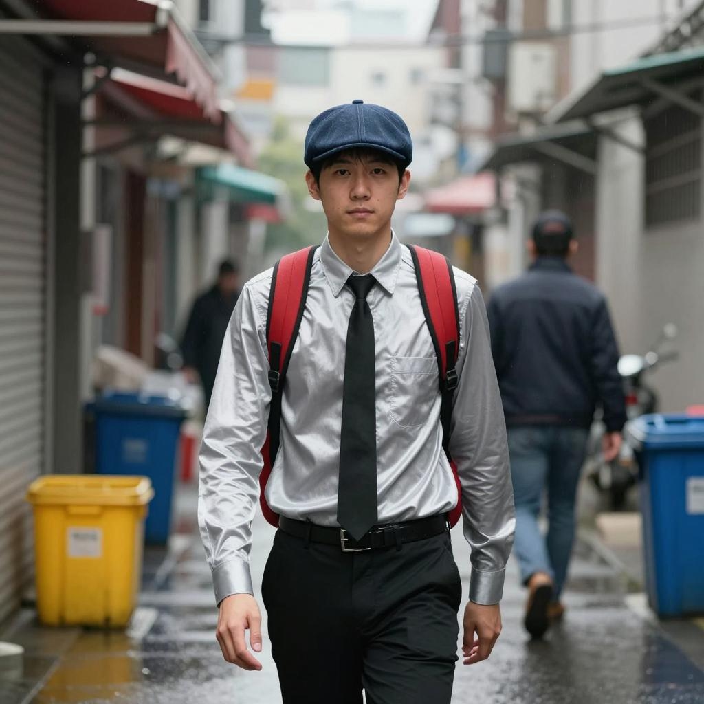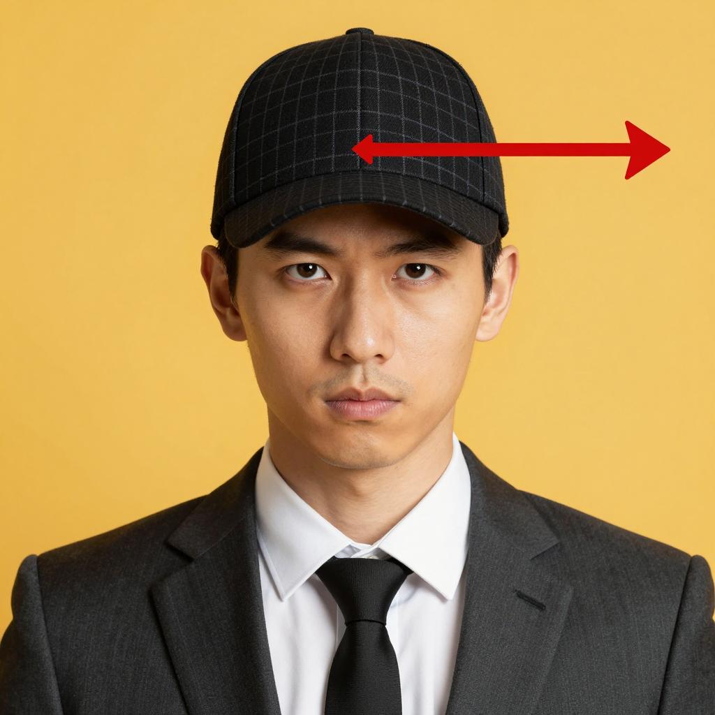 Photograph of a man wearing a black checkered hat with a red arrow sticking out horizontally from the right side. He has a serious expression, light skin, and is dressed in a dark suit with a white shirt and black tie. Bright yellow background. Upper body portrait.