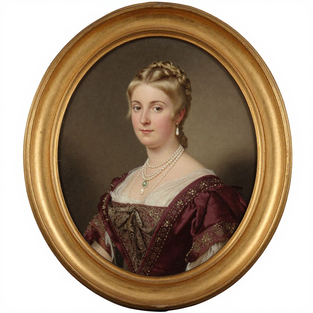 Elegant oval portrait depicting a woman with blonde hair styled in a braided updo, adorned with pearl jewelry and wearing a richly detailed maroon dress, encased in a gold frame, characteristic of the William IV Oval Cellarette from the early 19th century.