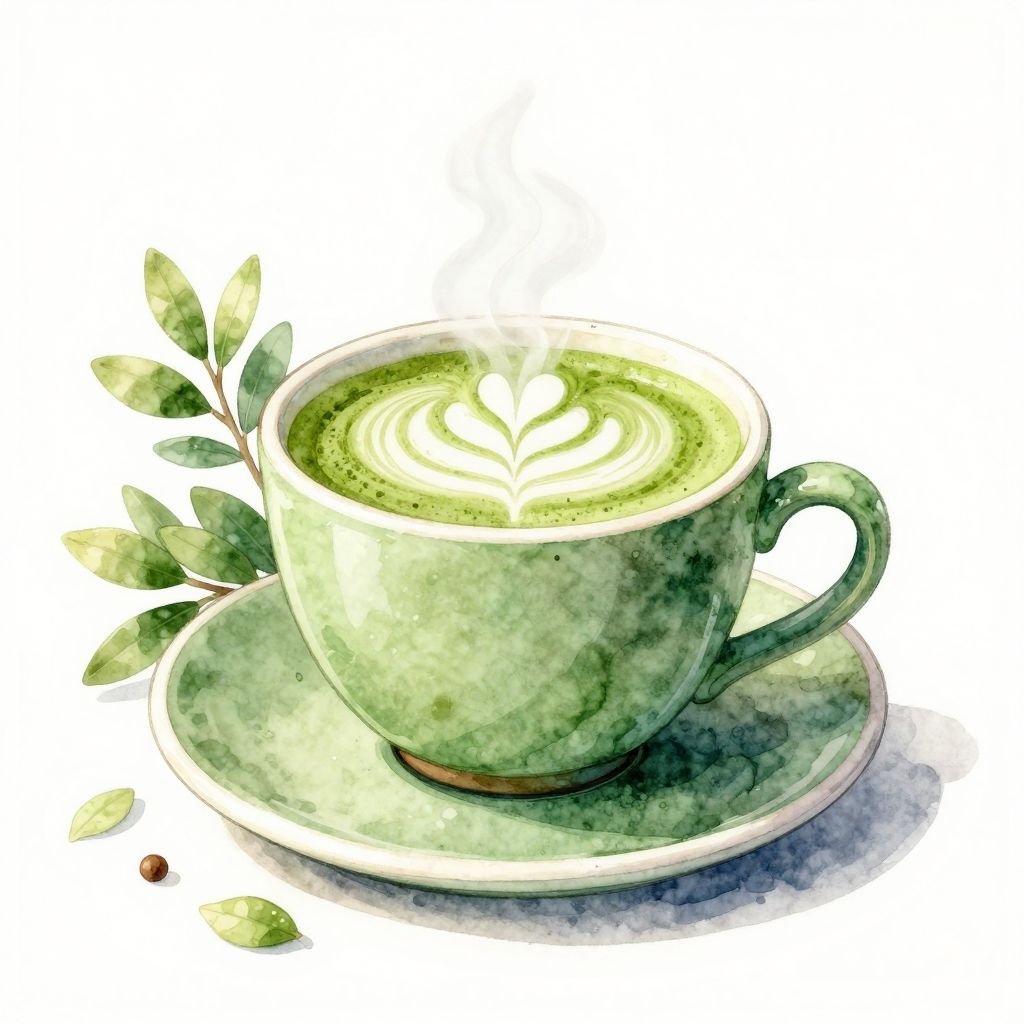 Artistic watercolor illustration of a steaming matcha latte served in a green ceramic cup with saucer. The composition features soft, whimsical green hues with fresh leaves around the cup, creating a cozy and inviting atmosphere.