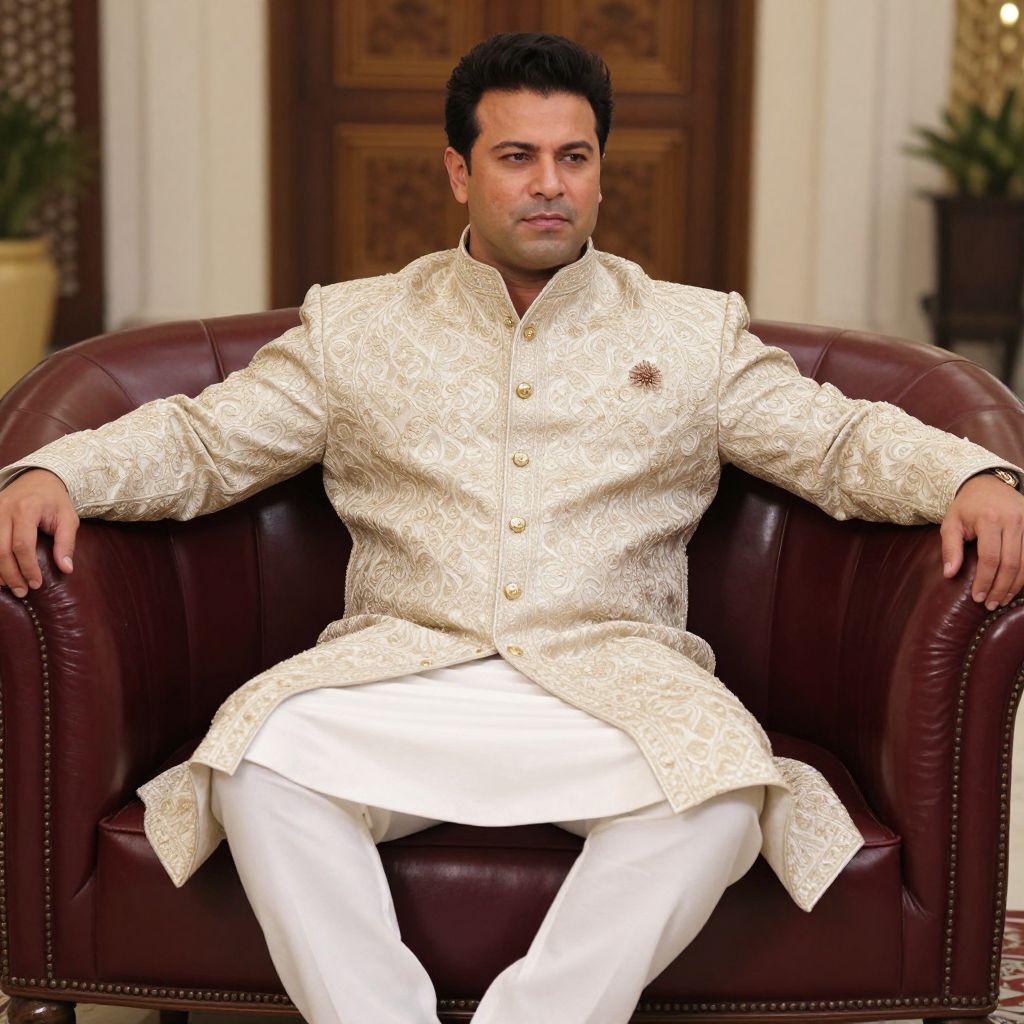 Photograph of a confident South Asian man in a cream, patterned sherwani and white pants, sitting on a brown leather chair in an elegant