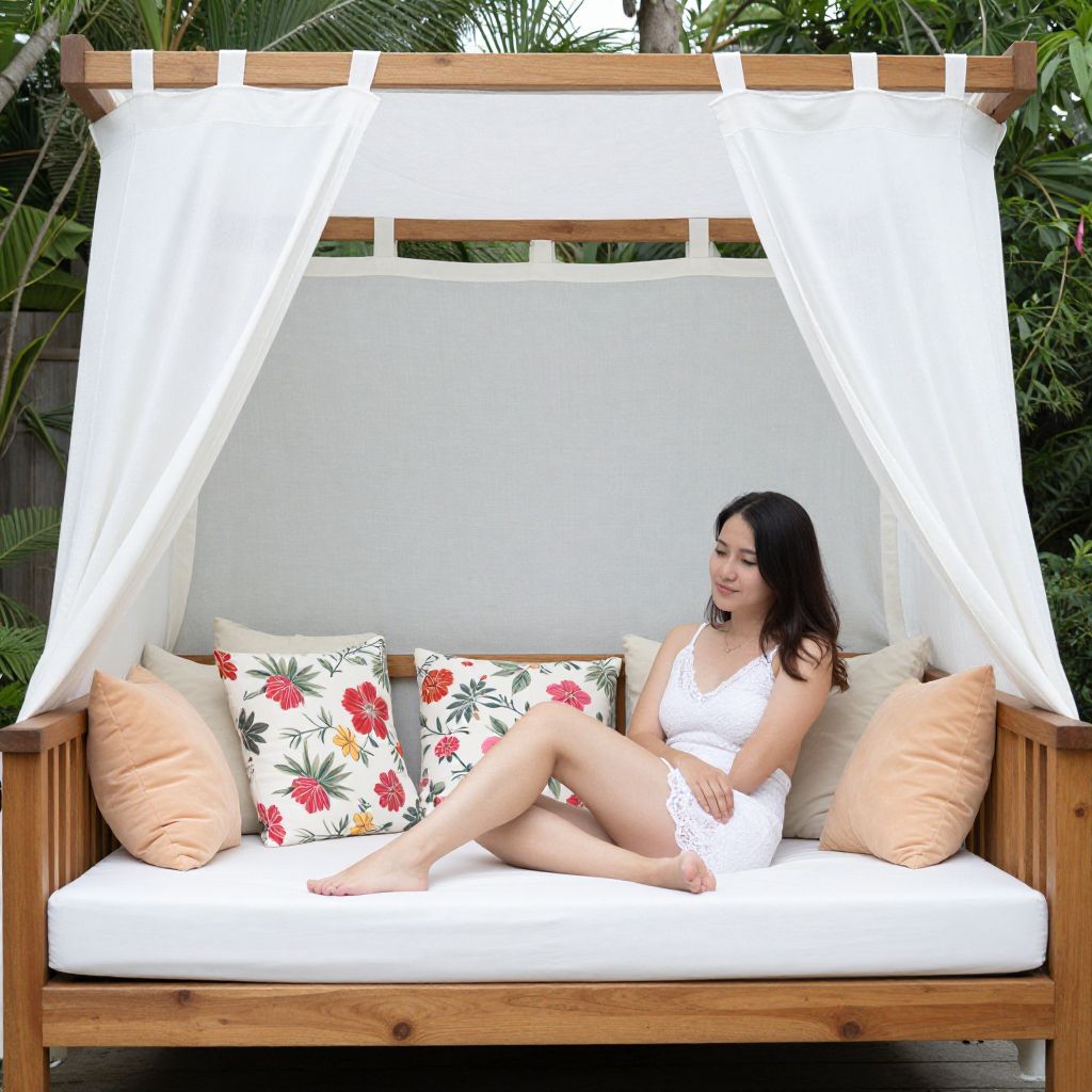 Comfortably lounging on a wooden daybed with a white canopy, a woman sits surrounded by plush cushions and floral pillows, enjoying a serene outdoor space against a backdrop of lush greenery.