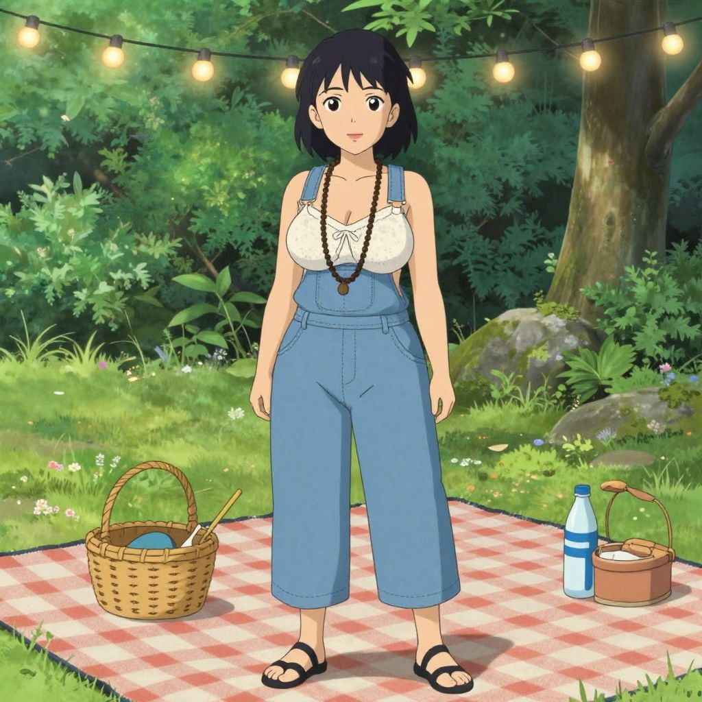 A svelte woman in casual boho style, wearing blue denim overalls layered over a white lace top, accessorized with a long beaded necklace and black strappy flat sandals, stands under string lights at a park picnic, captured in the vibrant visual style of Kyoto Animation. Sexy. Pretty face and beutiful eyes Sexy. Pretty face and beаutiful eyes. Big breasts