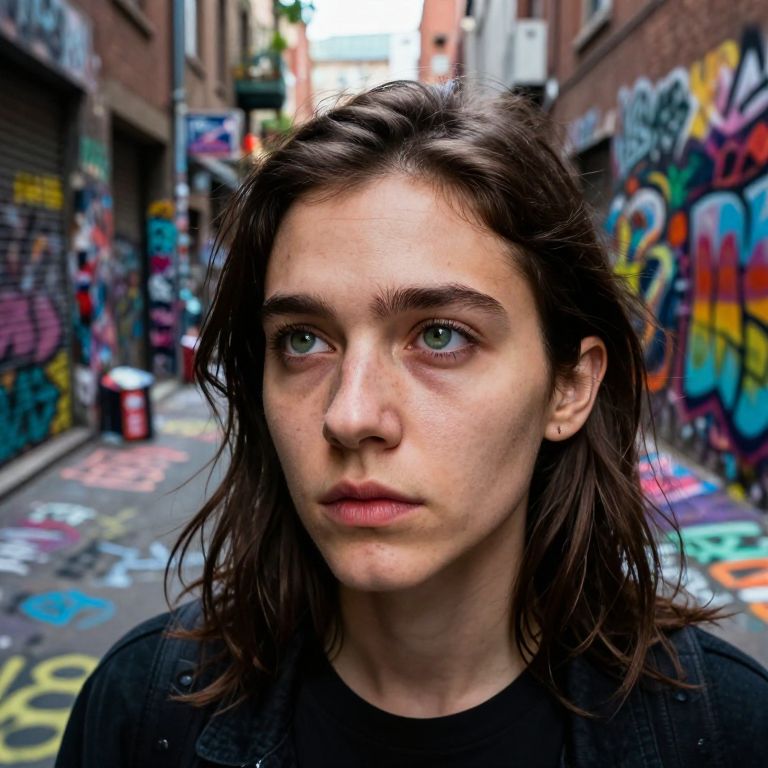 Envision a photorealistic portrait of an enigmatic artist with lined features and distant green eyes, their gaze fixed thoughtfully beyond the frame in an unconventional bird's-eye view. The vibrant graffiti-adorned urban alley forms a striking backdrop, contrasting the subject's introspective expression with their eclectic surroundings. This image captures the soulfulness of the individual amidst the rich textures of the cityscape, blending close-up intimacy with atmospheric grandeur to evoke a complex emotional gradient: curiosity, nostalgia, and contemplation.