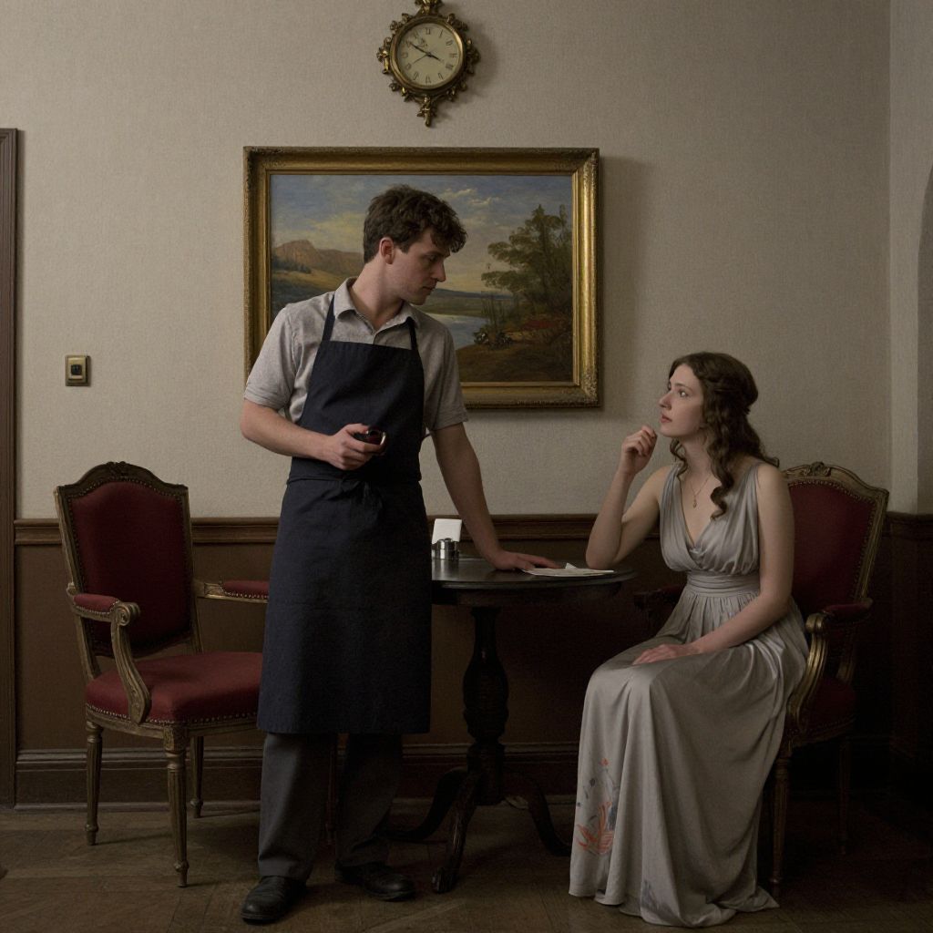 Photograph of a young waiter in a dark apron and shirt standing beside a seated woman in a white, floral dress, in a dimly lit