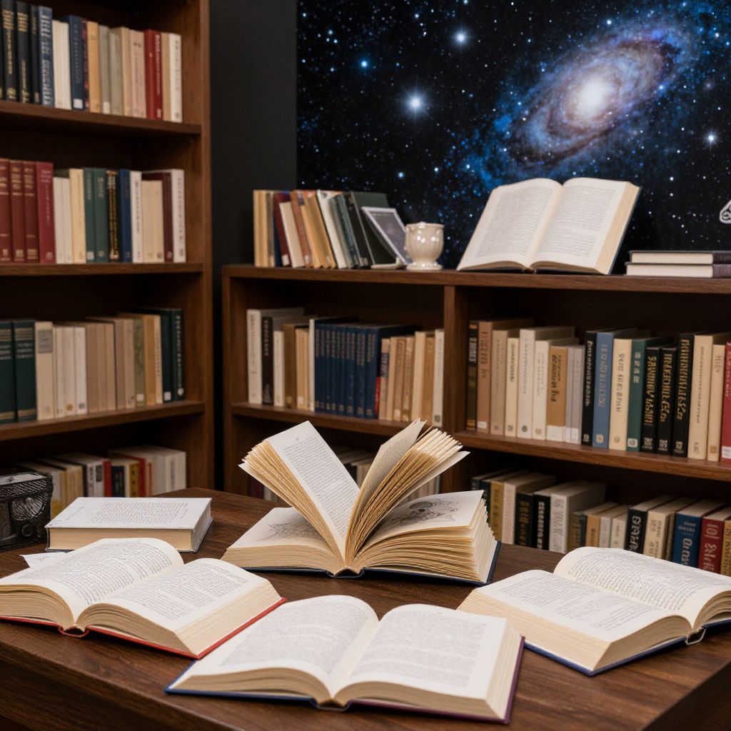 A celestial librarian tends to books with pages crafted from the memories of unborn children, organized by the tilt of the galaxy.