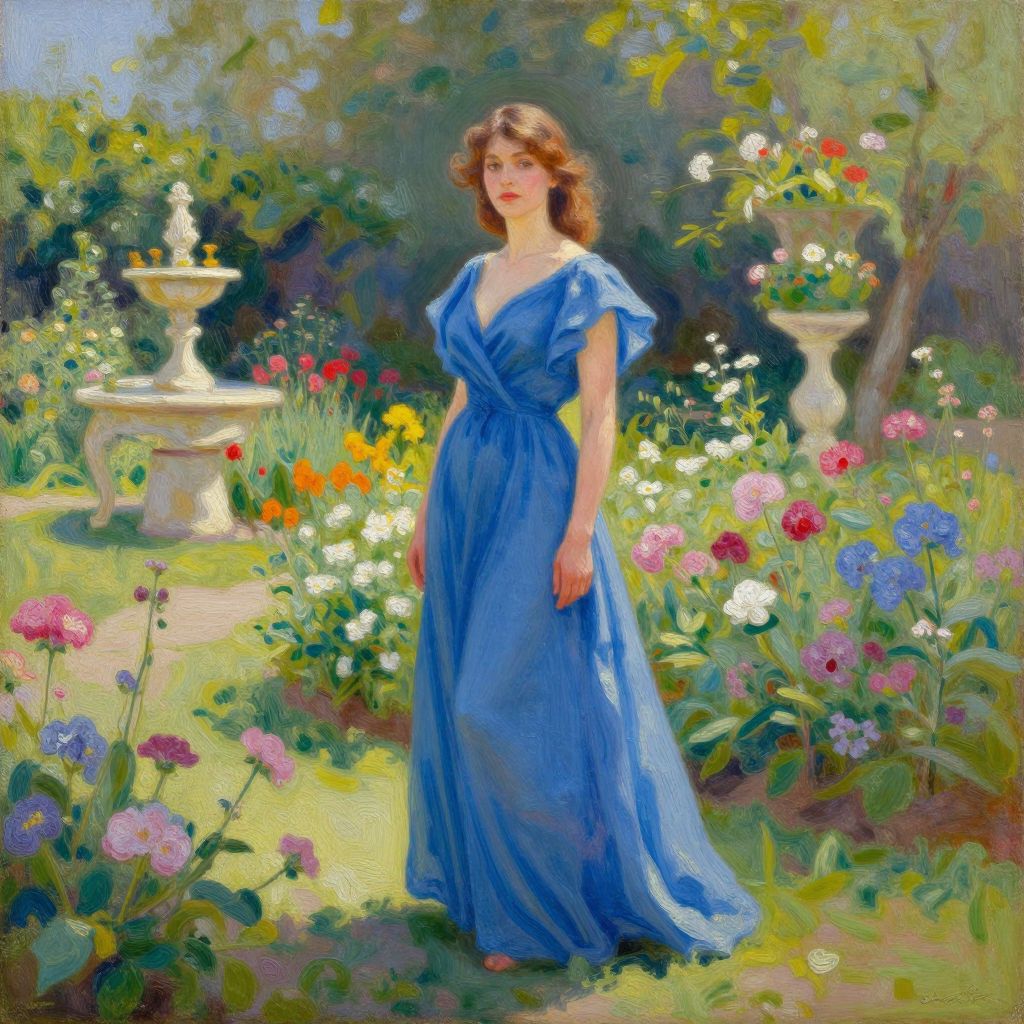 Vintage-style painting of a brunette woman in a flowing blue dress standing in a vibrant, colorful garden with a flower-filled fountain.