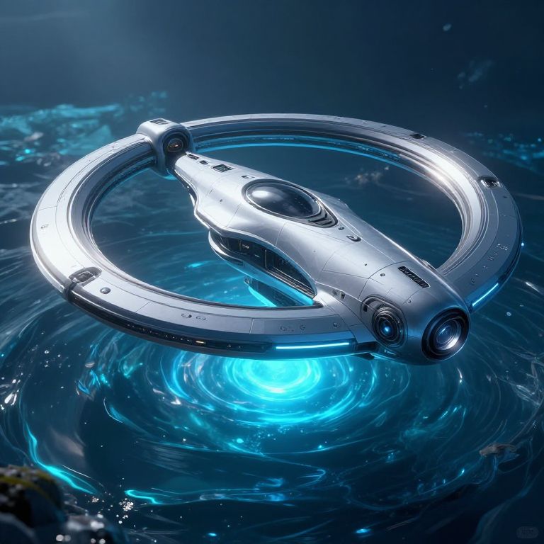 Photorealistic CGI of a futuristic, silver, ring-shaped spaceship hovering above a glowing blue energy vortex in a dark, watery environment.