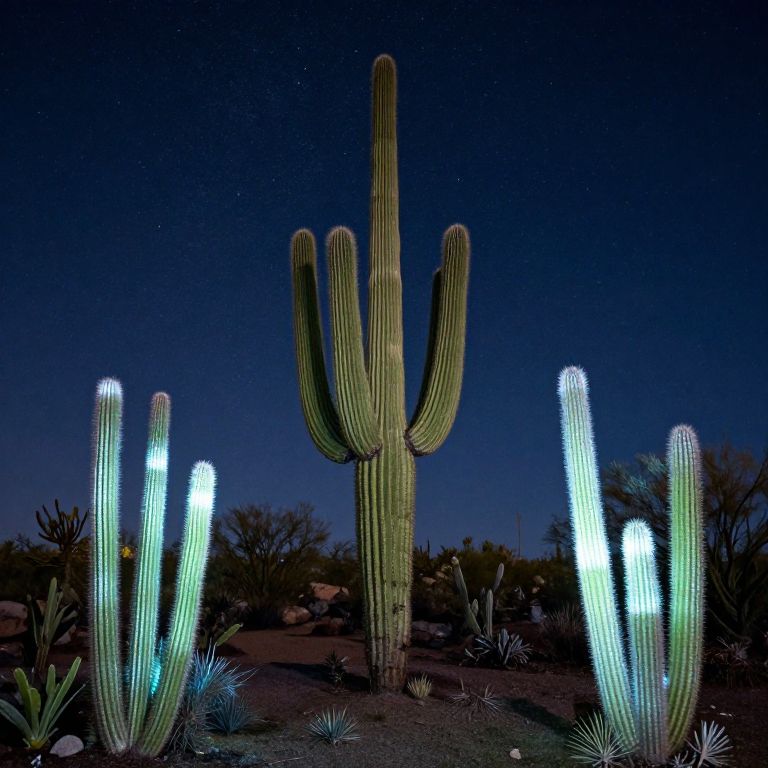 Desert landscape glows under starlit skies, featuring towering saguaro cacti flanked by luminous crystalline cacti that emit soft, ethereal light, creating a magical nocturnal scene.