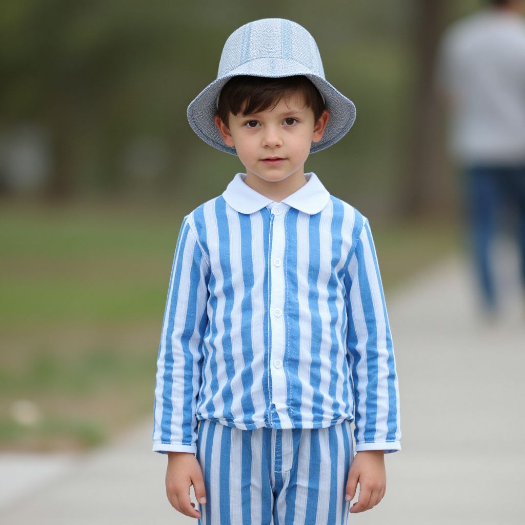 Boy with blonde hair wearing a white cap and white shirt with blue stripes and a white collar.