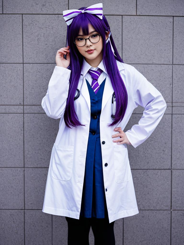 Photo-realistic cosplay photo of person in asakura rikako costume. 1girl, purple eyes, glasses, purple hair, long hair, very long hair, hair ribbon, lab coat, long sleeves. full body shot
