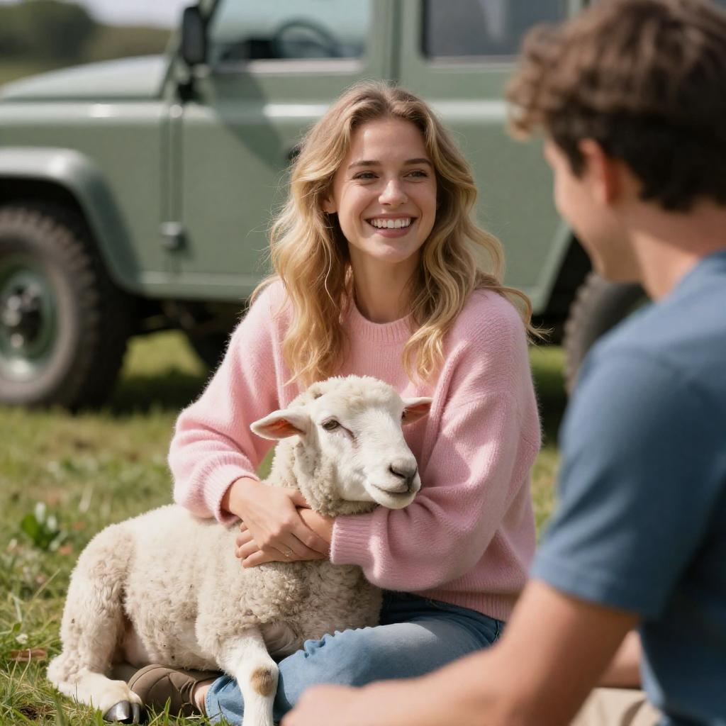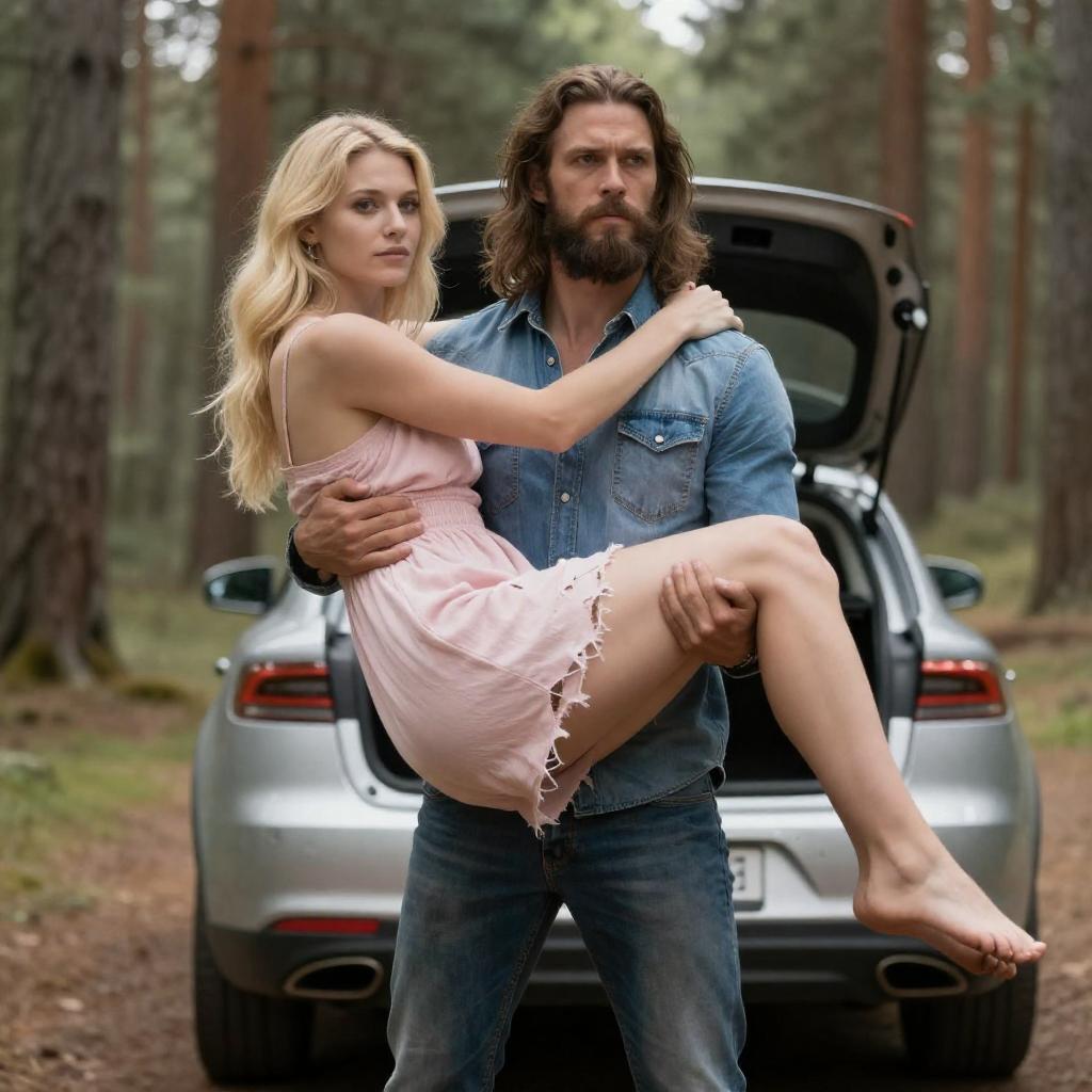 Blonde woman in blue floral shirt and white pants, leaning forward, chasing peacock with green tail feathers on a forest road. Red car in background, trees and shadows. Sunlight filtering through trees. Woman's face shows surprise. Peacock walking away.