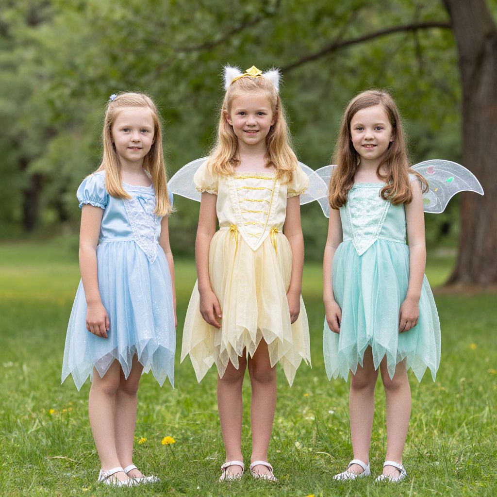 Three Good Fairies Costume, three little girls dressed up in fairy costumes standing in a park