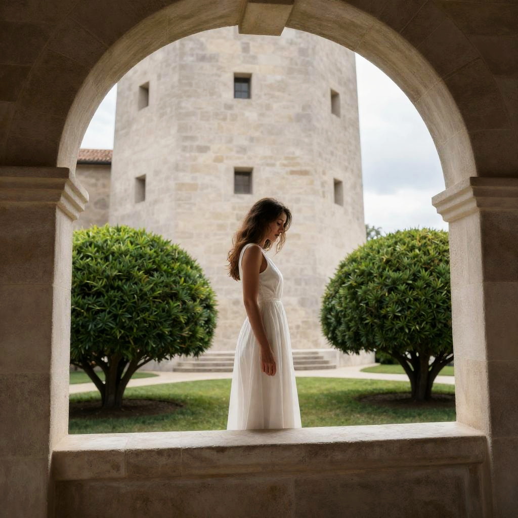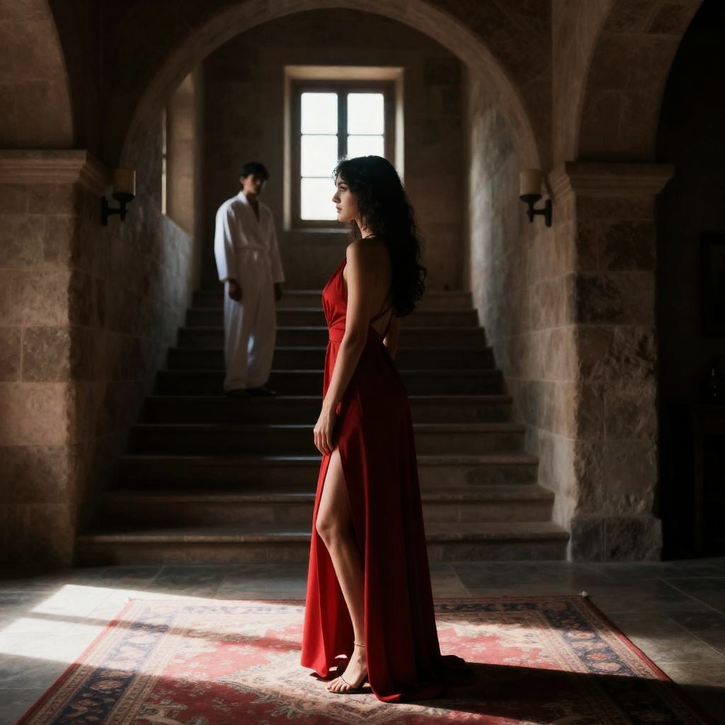 Photograph of a dimly lit stone hall with sunlight streaming through a window. A woman in a red, sleeveless gown with a high slit stands in the foreground, facing away. A man in white stands on a staircase in the background, partially obscured by shadows. Patterned rug on the floor, wall sconces, and archways frame the scene.