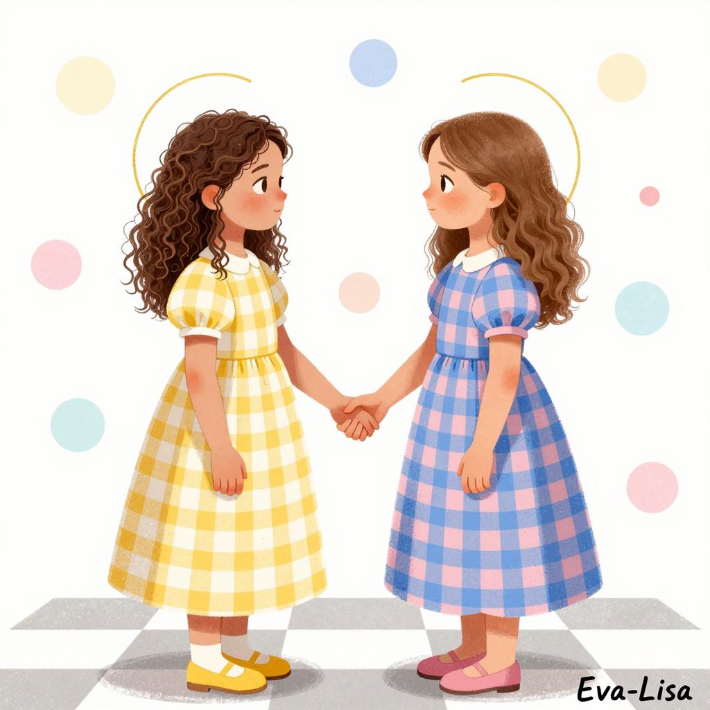 Illustration of two young girls facing each other, holding hands. Both have curly brown hair, fair skin, and wear long, checkered dresses—one in yellow and white, the other in blue and pink. Gold halos behind their heads. Background filled with circular patterns in various colors. Girls stand on a checkered floor, looking at each other with calm expressions. Artist's "Eva-Lisa" at bottom.