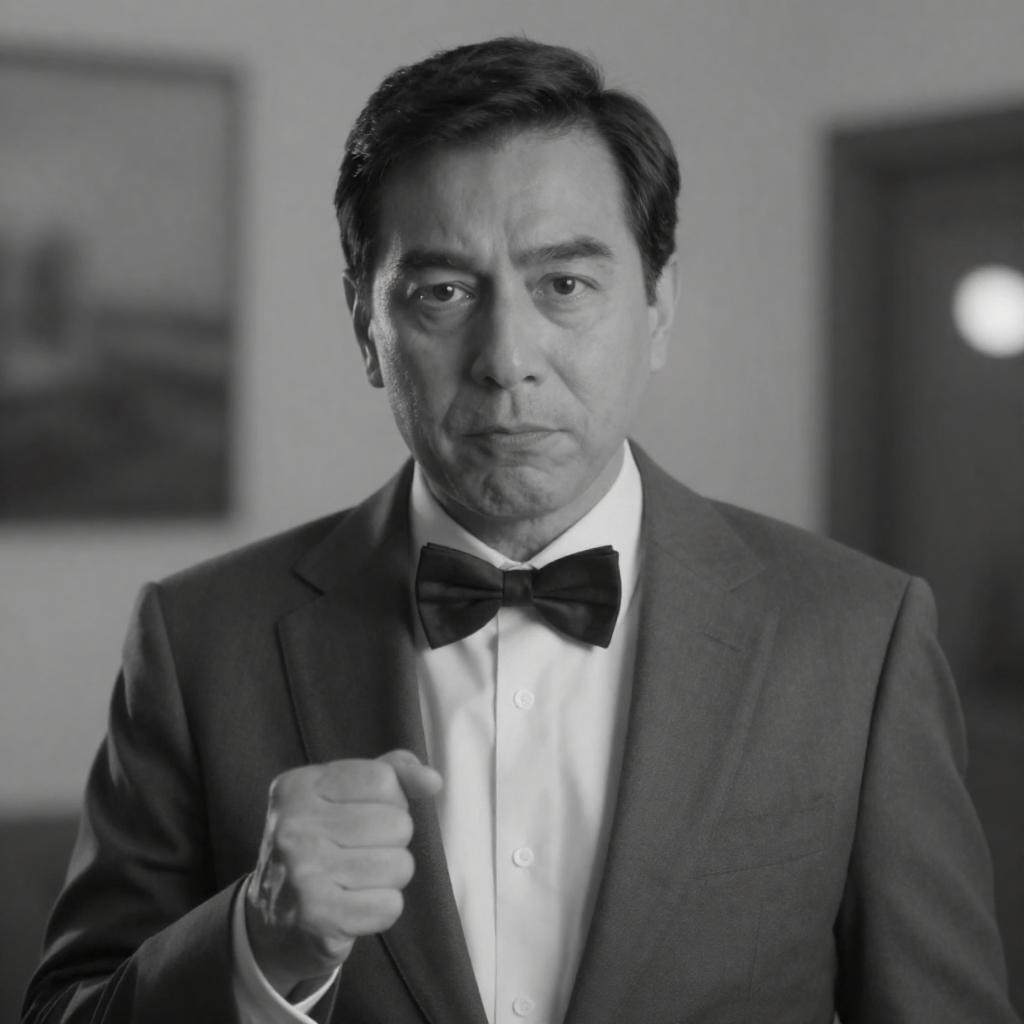 Black-and-white photograph of a middle-aged man with short, slightly disheveled hair, wide eyes, and a surprised expression. He wears a dark shirt with a collar, a chain necklace, and a white jacket with black stripes. The background is blurred, focusing attention on his expressive face.