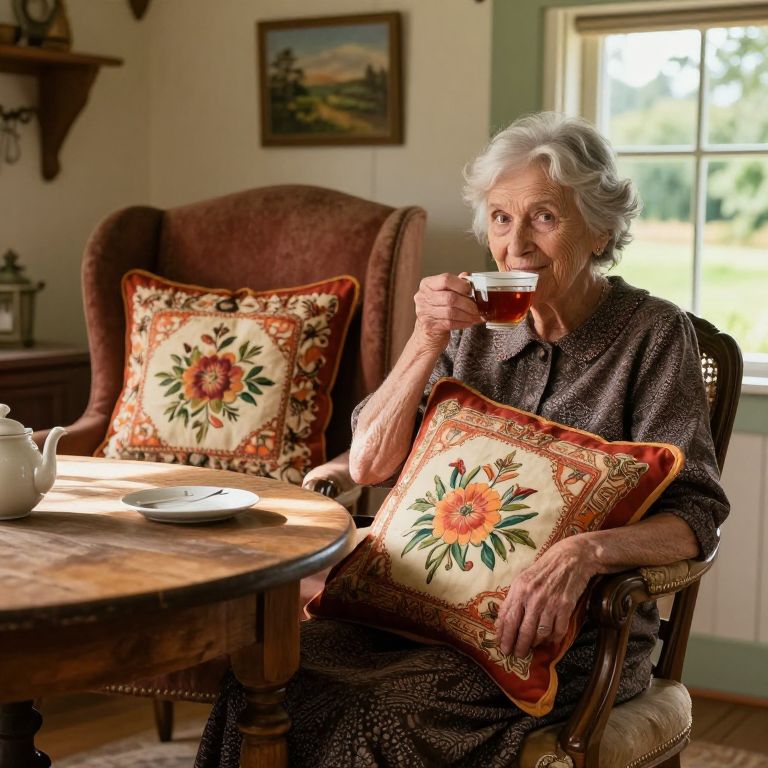 A sunlit countryside cottage with a wooden dining table and a vintage wingback chair. Ornate pillows with hand-painted floral motifs and intricate detailing in red, orange, and cream are positioned on the chair and table. A grandmother with silver hair, kind eyes, and a small smile sips tea, her hands resting on the armrest.