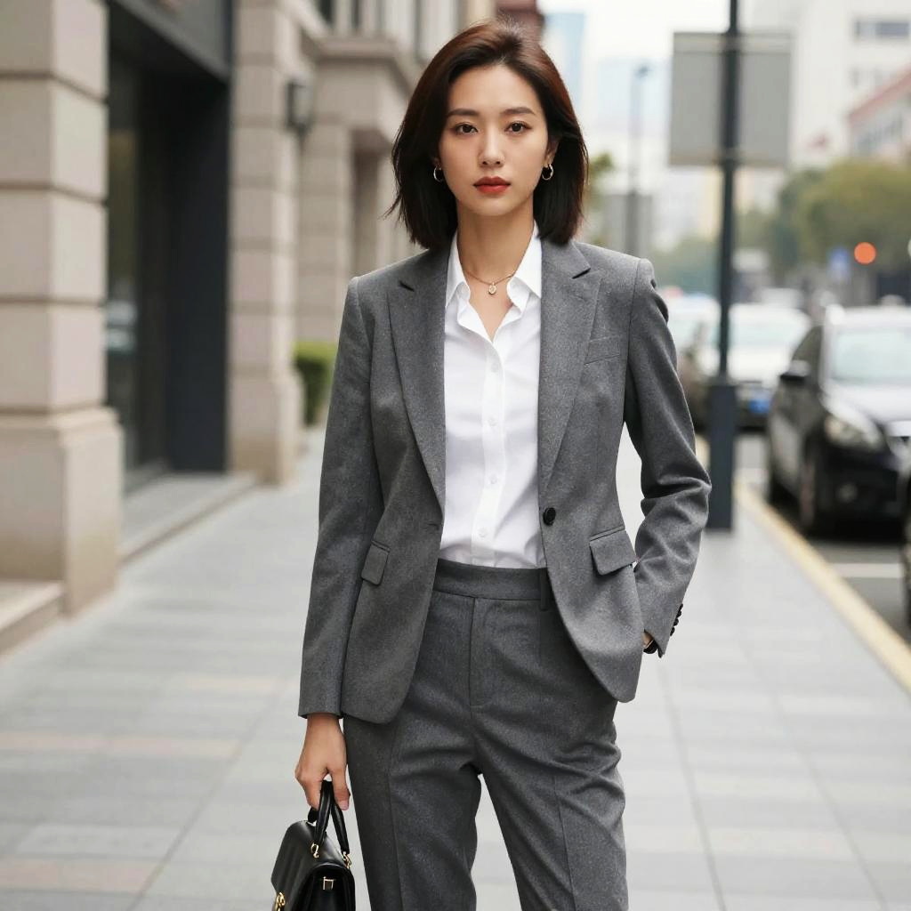 Stylish Look, woman in a gray suit and white shirt standing on a street