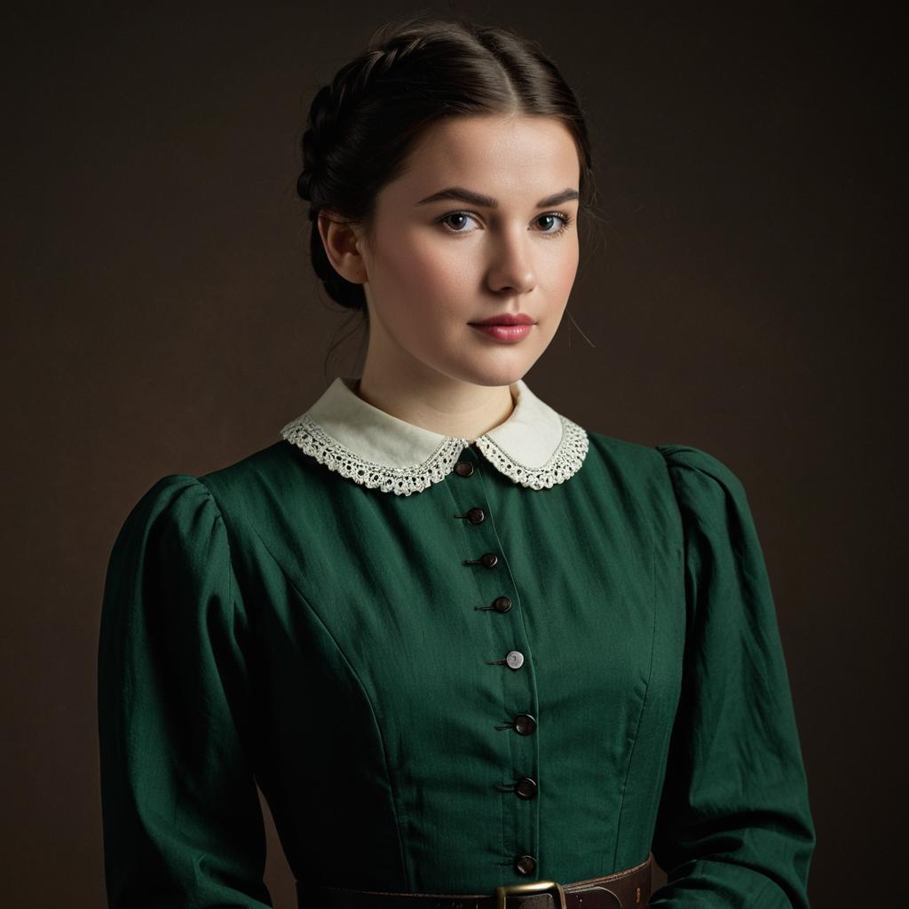 Handmaid cosplay, photorealistic, woman, standing, full body, medieval style, red long-sleeved dress, white collar, white cuffs, white headscarf, black ribbon bow, brooch on chest, hand on hip, serious expression, brown hair, fair skin, brown eyes, indoor, muted background, soft lighting, realistic ures, historical clothing, detailed fabric, subtle shadows, portrait orientation, realistic rendering, CGI, high detail, period costume, elegant, poised, classic, historical, realistic colors, medium shot, realistic shadows, professional quality, subtle color gradient background.