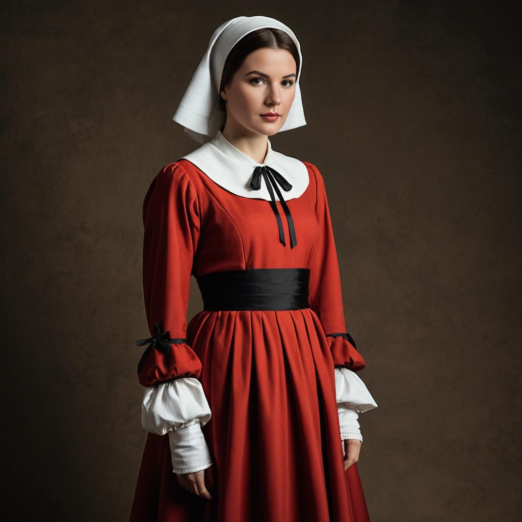 Photorealistic portrait of a woman dressed in a medieval-style red long-sleeved dress with white cuffs and collar, and a white headscarf. She wears a black ribbon bow at the neckline and a wide black belt. The woman has brown hair, fair skin, and brown eyes, posed indoors against a muted background with soft lighting.
