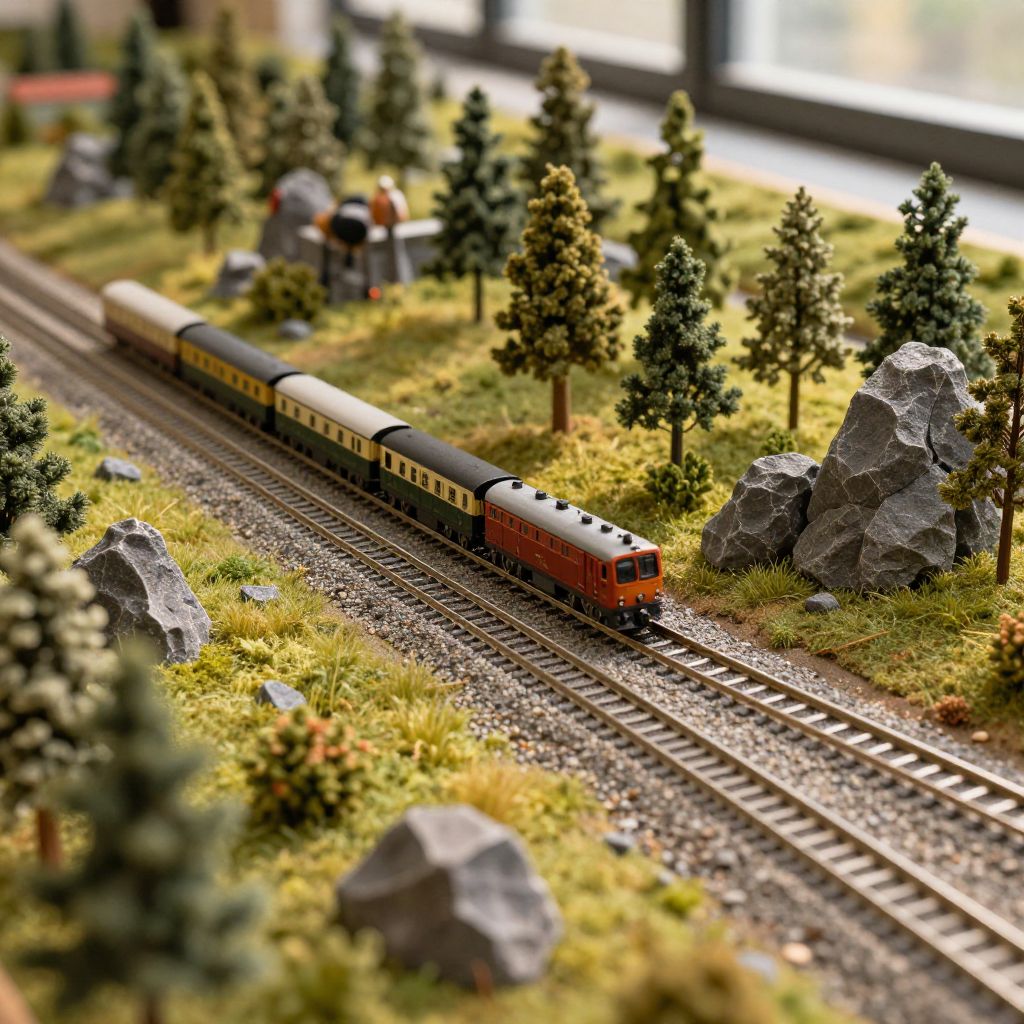 Noch model railway scenery with detailed miniature trees, realistic grass patches, and intricate rock formations, captured in warm natural light, showcasing a vibrant and lifelike landscape perfect for model train enthusiasts.