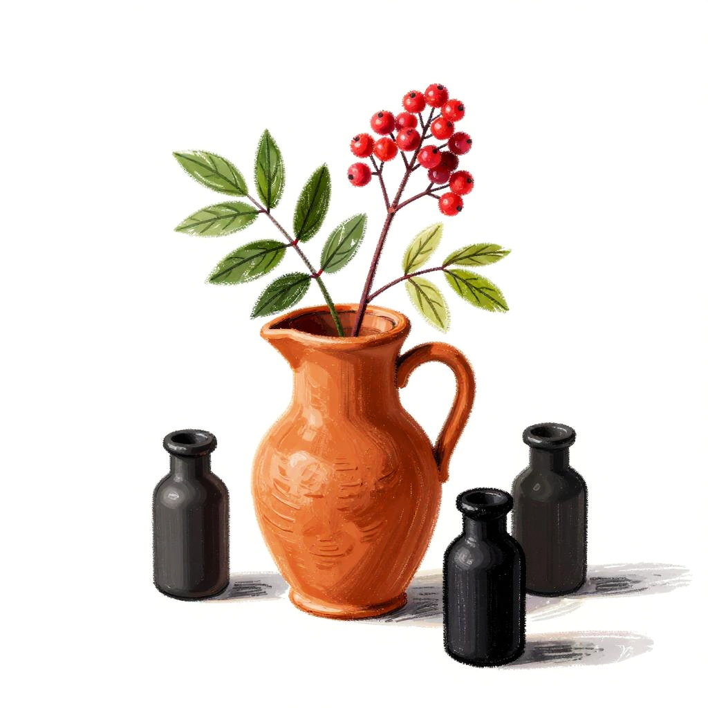 A bold chalk pastel sketch featuring a textured burnt orange clay pitcher holding a short sprig of clustered red berries and green leaves, on a seamless white background with three small empty matte black bottles nearby; high contrast, bold accent colors, thin clean lines, balanced composition, generous negative space, soft studio lighting, modern minimalist aesthetic, crisp edges, no text, no watermark
