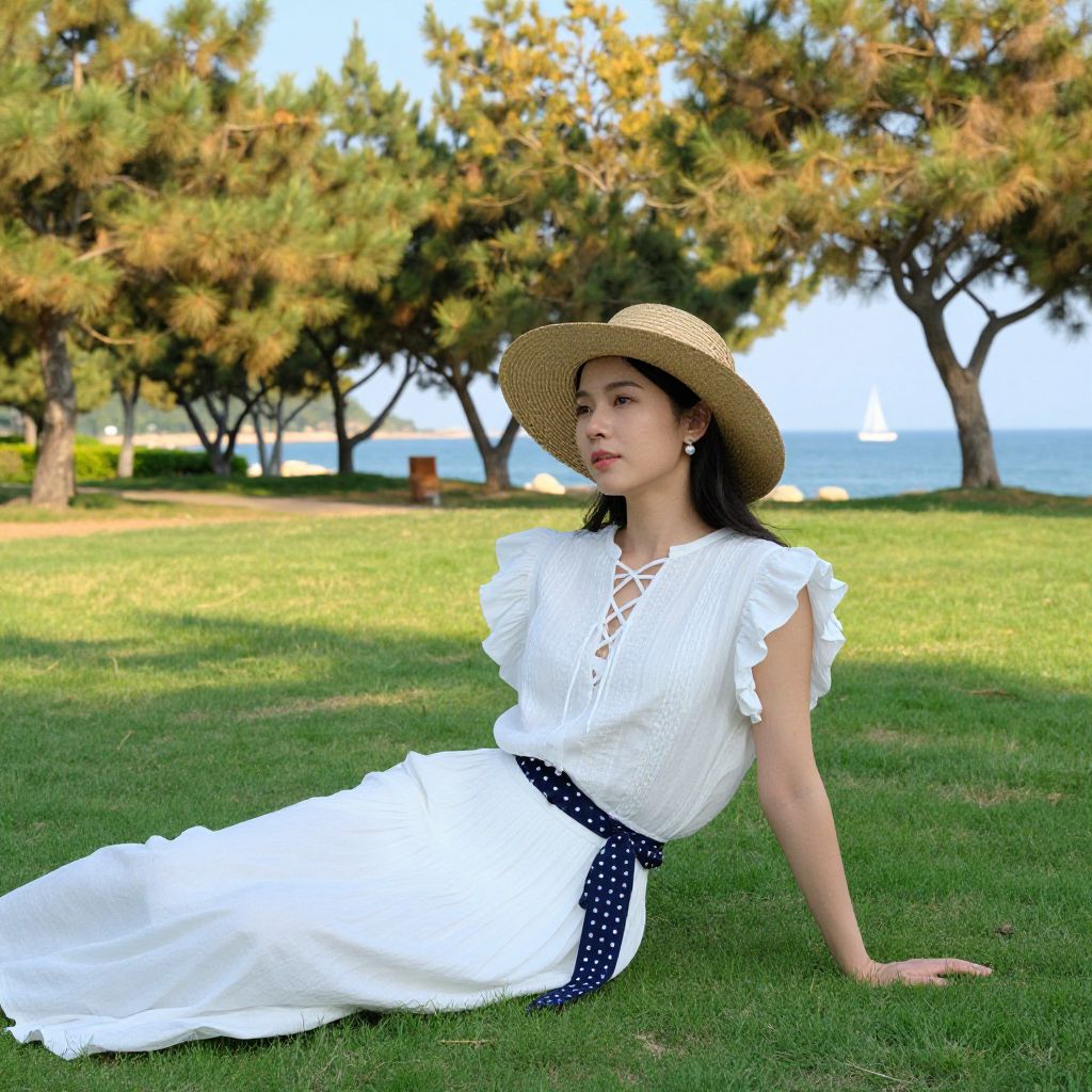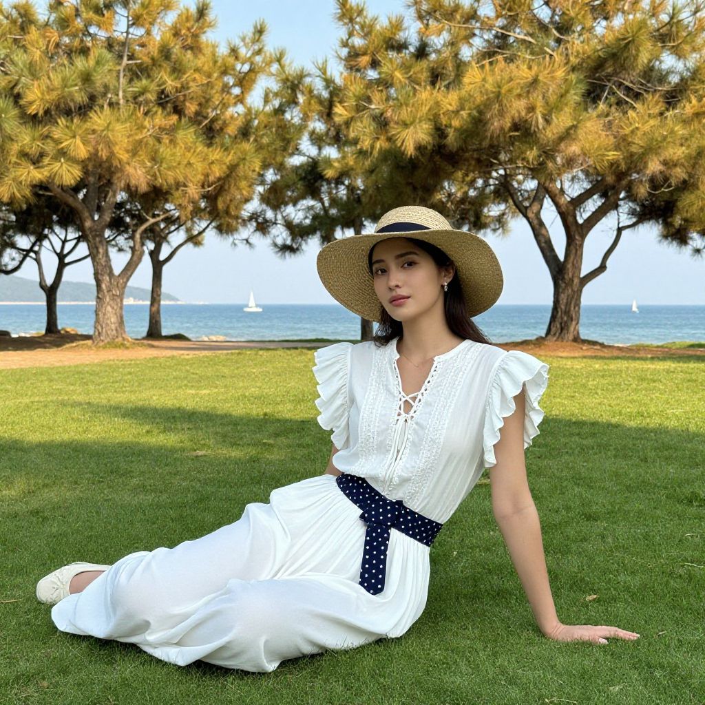 Photograph of an Asian woman with fair skin and long black hair, seated on a lush green lawn. She wears a wide-brimmed straw hat, a white, lace-trimmed, short-sleeve blouse, and a white, flowy skirt belted with a navy blue, polka-dotted scarf. The background features a serene seaside view with a blue sky, calm ocean, and distant white sailboats. Tall, leafy trees frame the scene, casting dappled shadows on the grass. The woman gazes slightly to the right with a relaxed, serene expression.
