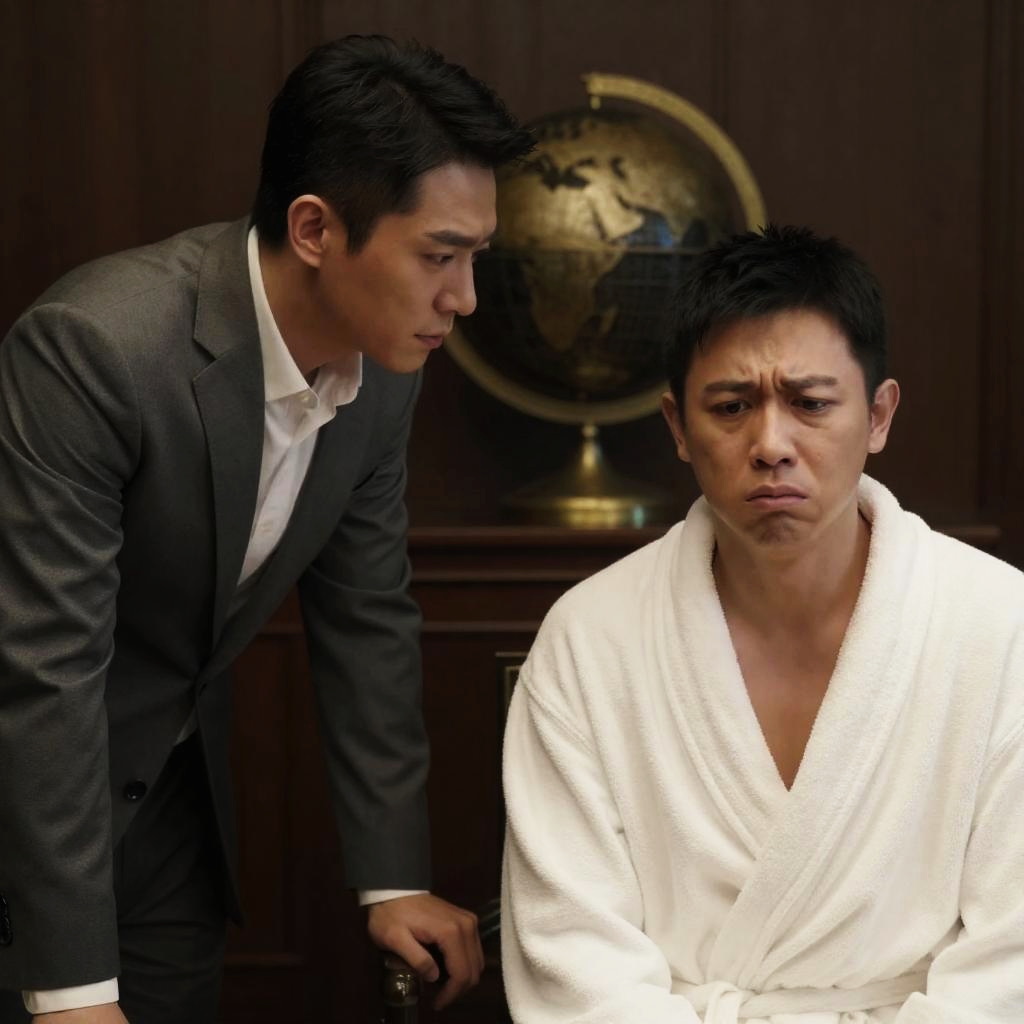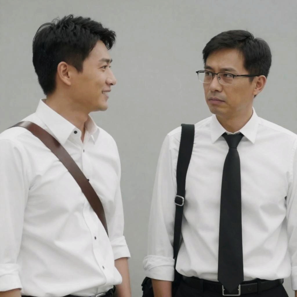Photograph of three Asian men engaged in a serious discussion in an indoor office setting. The central man wears a gray suit, white shirt, and black tie, pointing authoritatively at the man on his left in a black suit and white shirt. The right man, dressed in a beige polo shirt, clasps his hands and looks attentively at the central man. Brown wall and blurred signage in the background.