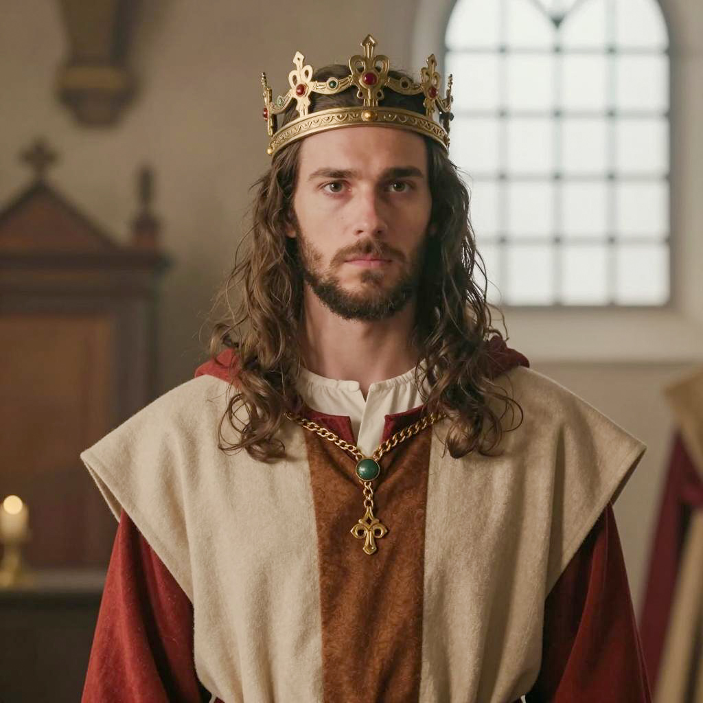 Christmas shepherd costume, photograph of a young man with long dark brown hair and a beard, wearing a crown with intricate design, beige and brown robe with red sleeves, white undershirt, serious expression, indoor medieval setting, soft light, blurred background with wooden furniture and a window with iron bars, warm tones, realistic style