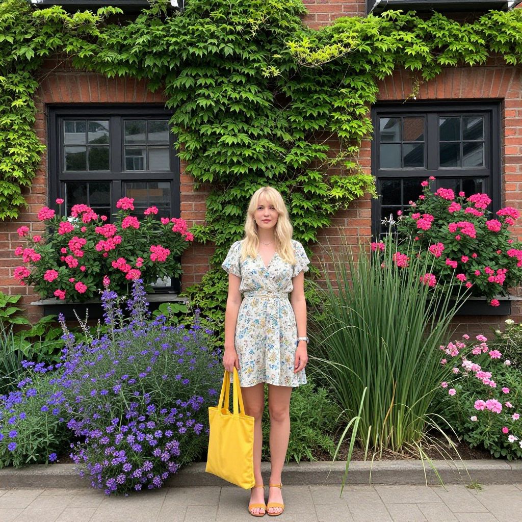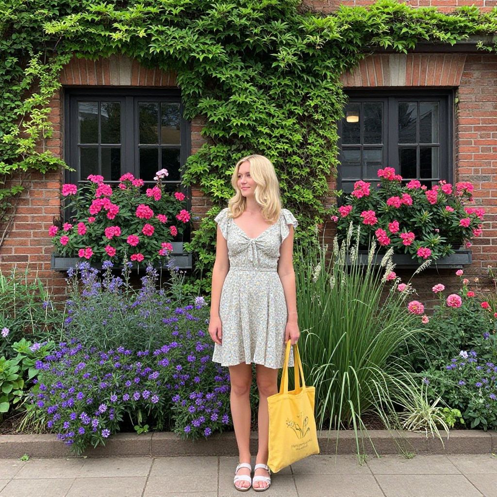 Blonde woman standing gracefully in front of a brick building adorned with lush green ivy and vibrant pink flowers, wearing a floral dress and carrying a yellow tote bag, surrounded by a picturesque garden filled with purple and pink blooms and tall green plants.