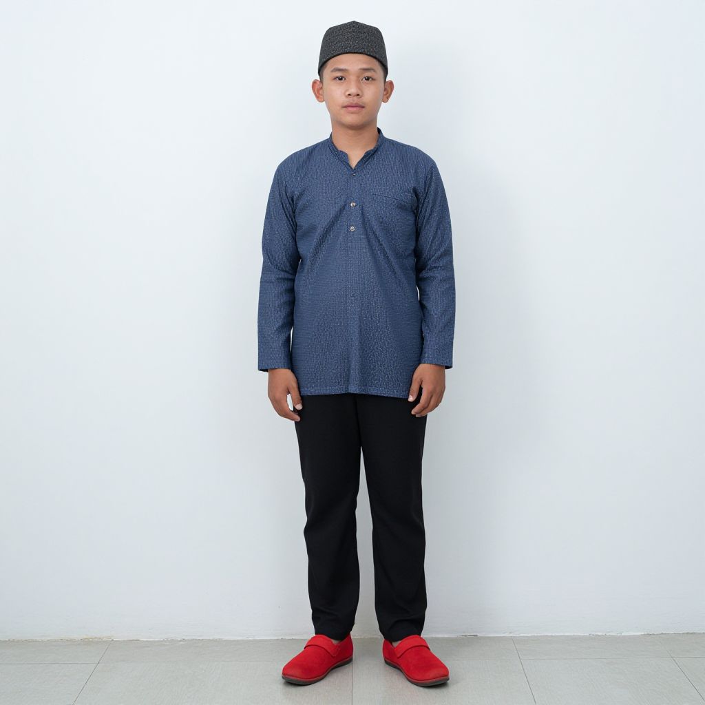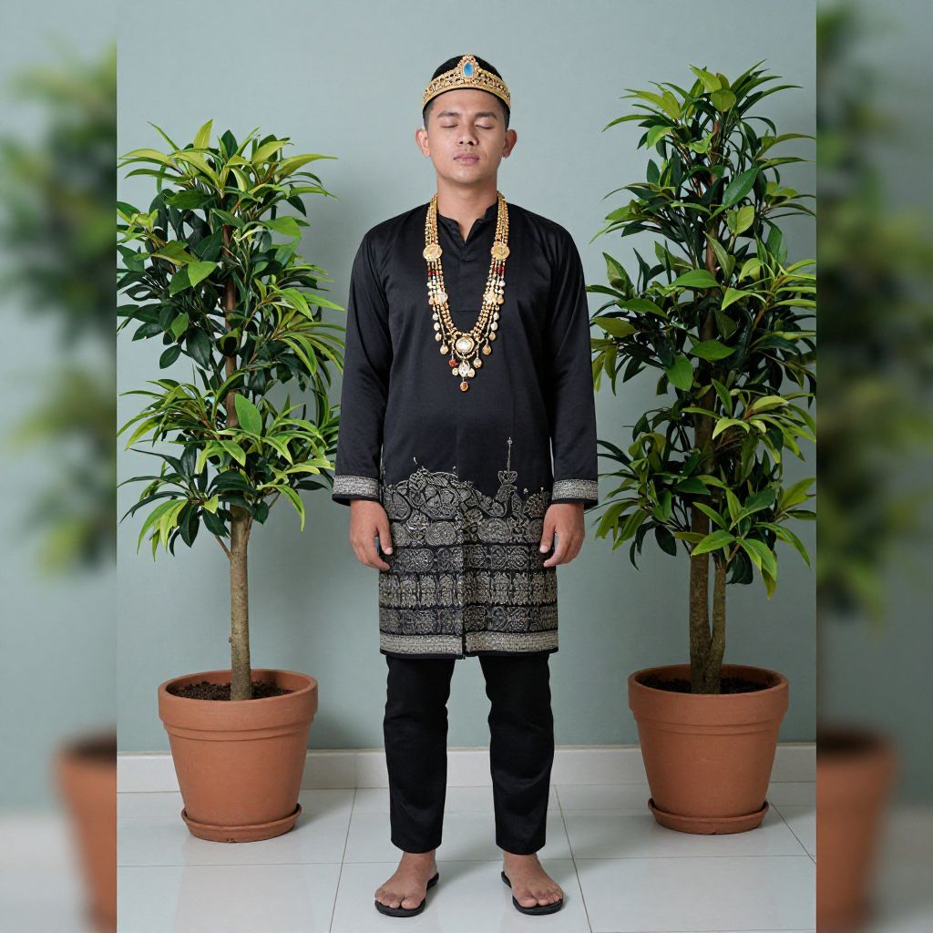 Photograph of a young Southeast Asian man in traditional black Baju Melayu with intricate silver embroidery, gold necklaces, and a patterned head