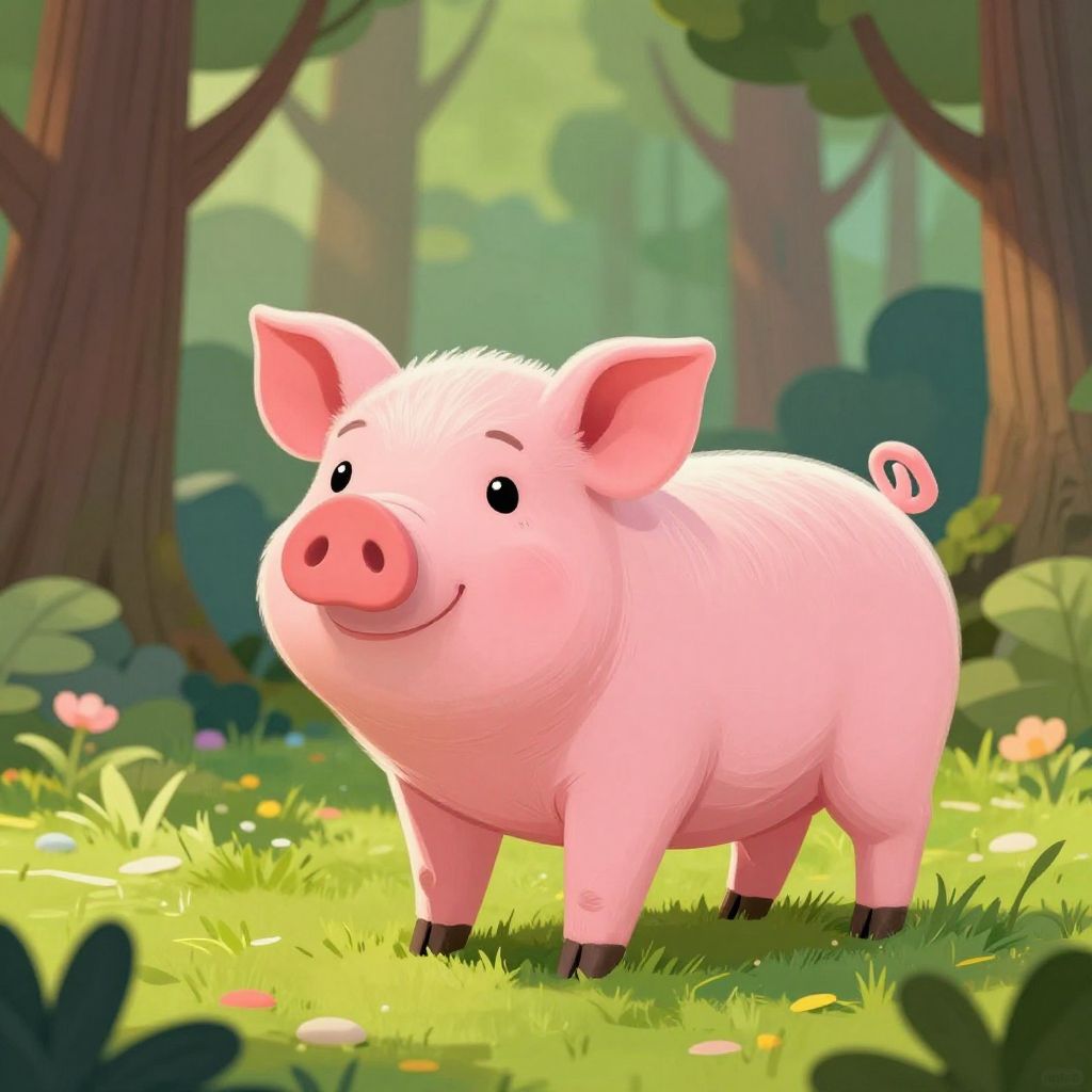 Pig standing on two legs in a whimsical forest clearing, soft sunlight filtering through tall trees, detailed pink skin texture, cartoon style with vibrant colors
