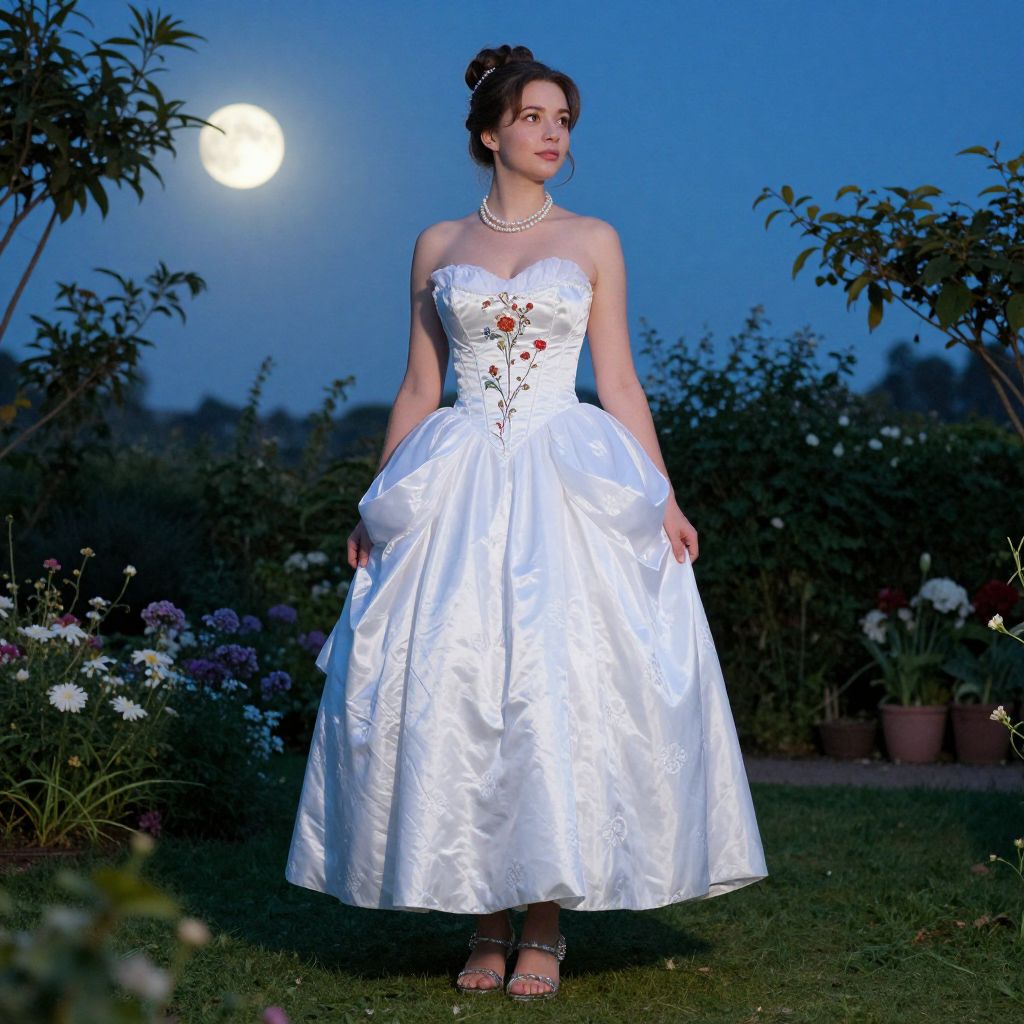 A photorealistic scene of a woman dressed as Cinderella in full costume standing outdoors under a moonlit garden at dusk, wearing a classic white gown with a corset and a floral embroidered bodice, a pearl necklace, and a pair of elegant glass slippers; her face is clear and youthful, with warm brown eyes and natural makeup, looking confidently toward the horizon.. The woman has big tits and cute face