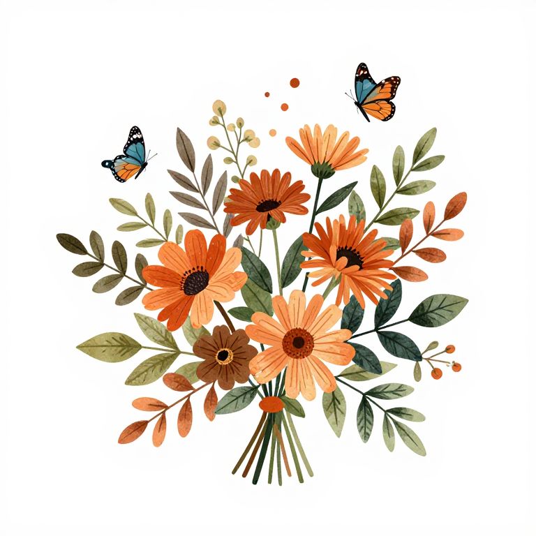 The image presents a boho-style bouquet of flowers and leaves, accompanied by butterflies, all set against a white background. The bouquet is composed of various flowers in shades of orange, brown, and green, with leaves in deep greens and browns. The flowers are arranged in a loose, natural manner, creating a sense of abundance and organic flow. Butterflies, in hues of blue and orange, are scattered throughout the bouquet, adding a whimsical touch. The overall composition is balanced, with the flowers and leaves creating a harmonious arrangement that draws the eye across the image. The absence of gradients and shadows emphasizes the flat, vector-like quality of the illustration, giving it a clean, graphic appearance. The interplay of colors and textures, along with the intricate details of the flowers and leaves, contribute to the image's boho aesthetic.
