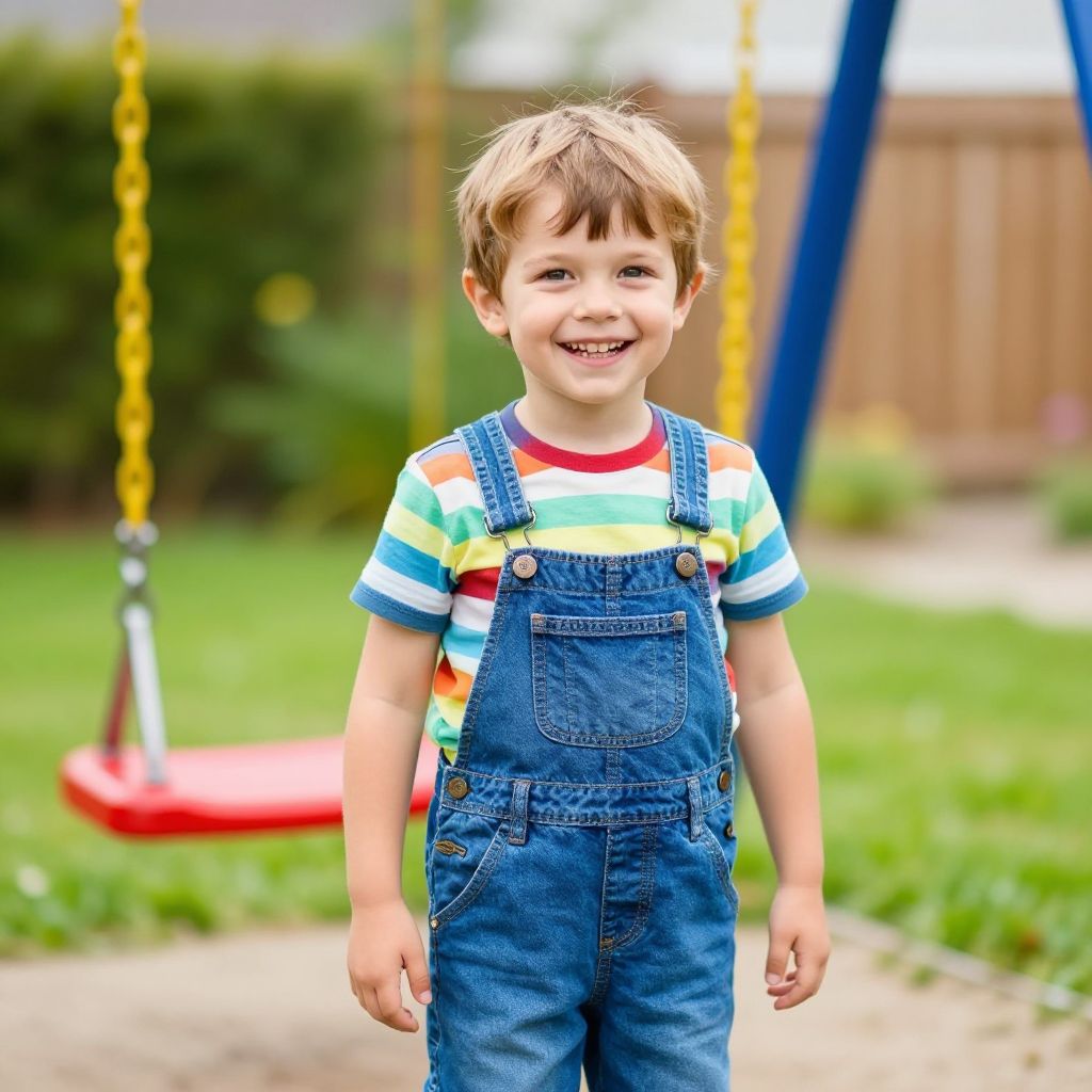 A joyful 6-year-old boy with light brown hair and a playful grin stands in a cheerful backyard playground. He is wearing a striped short-sleeve shirt with multicolored stripes and blue denim overalls. The background features a colorful swing set with yellow chains and a red swing seat, along with green grass and a fence.