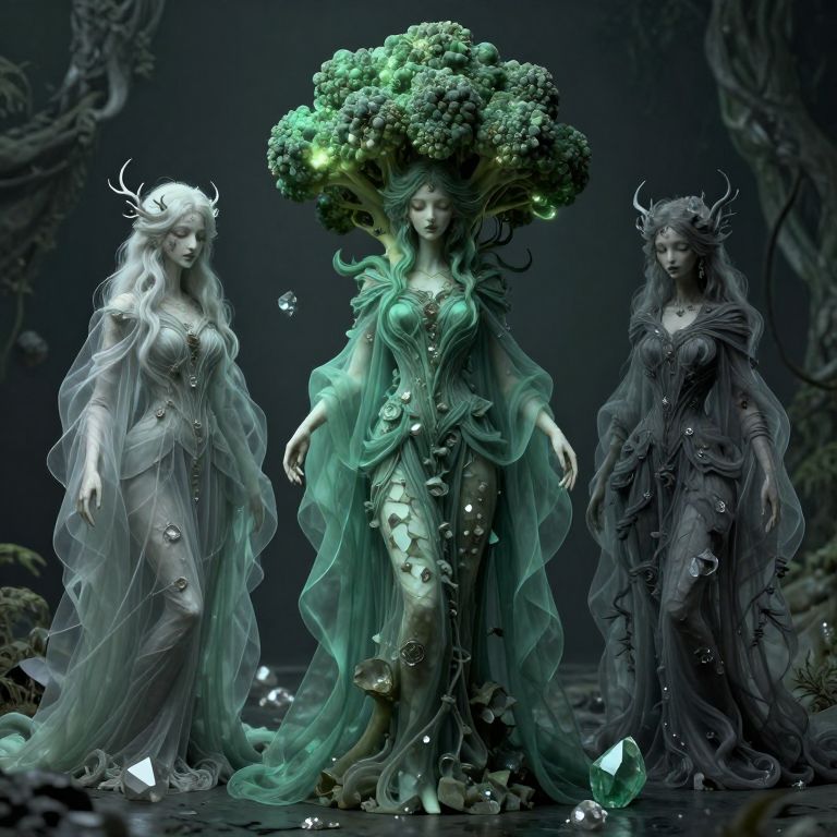 Digital artwork of three ethereal, fairy-like women standing in a dark, mystical forest. The central figure has a large, lush green tree-like headdress, wearing a translucent, green, leafy dress with glowing crystals. Her skin is a pale green, and she exudes a serene, commanding presence. On either side, two women with long, flowing hair and antler-like horns wear translucent, grayish dresses adorned with smaller crystals. The background is shadowy with twisted tree roots, enhancing the otherworldly atmosphere. The overall style is fantasy realism, with a focus on intricate, nature-inspired details and a soft, magical light.