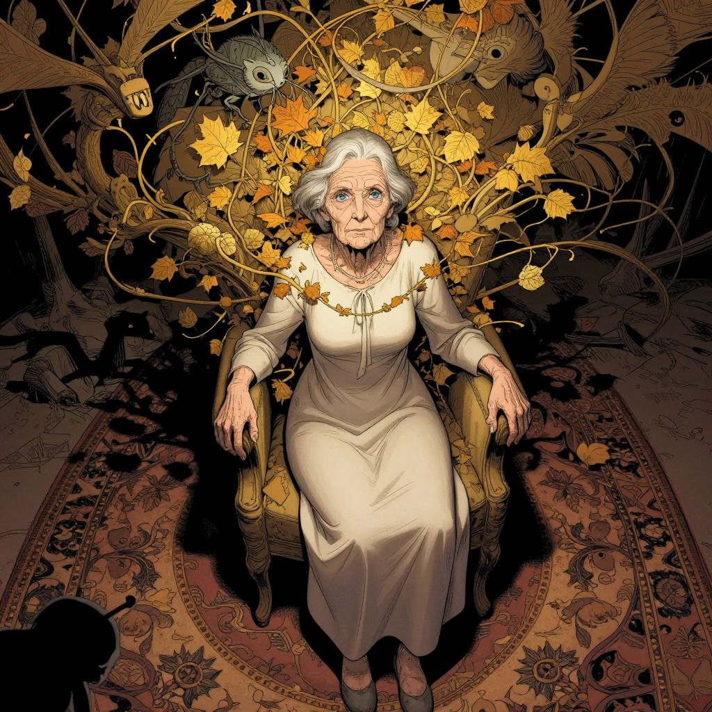 This digital illustration depicts an elderly woman with short white hair and blue eyes, seated in an ornate, golden armchair. She wears a simple, white, long-sleeve dress and light-colored shoes. Her expression is solemn, with slightly furrowed brows. Above her head, golden autumn leaves and intricate, swirling vines intertwine with two large, winged creatures resembling birds. A small, gray fish hovers among the leaves. The background is dark, with a patterned, red and brown rug beneath her chair. The image's style is reminiscent of graphic novel art, with bold lines and vivid colors.